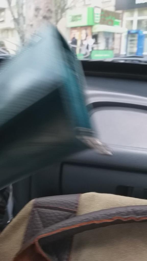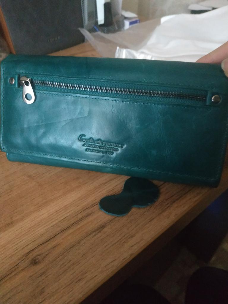 I arrive somewhat scraped or grated...it seems to be used. It is spacious and pretty. The color is somewhat strange, between gray and military green Very soft and yes it smells like genuine leather.