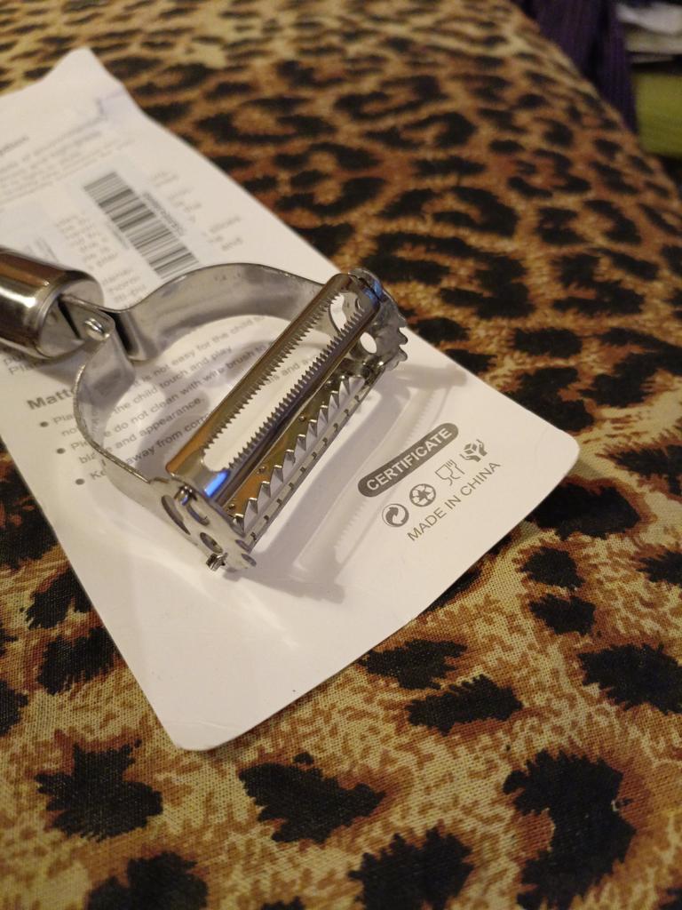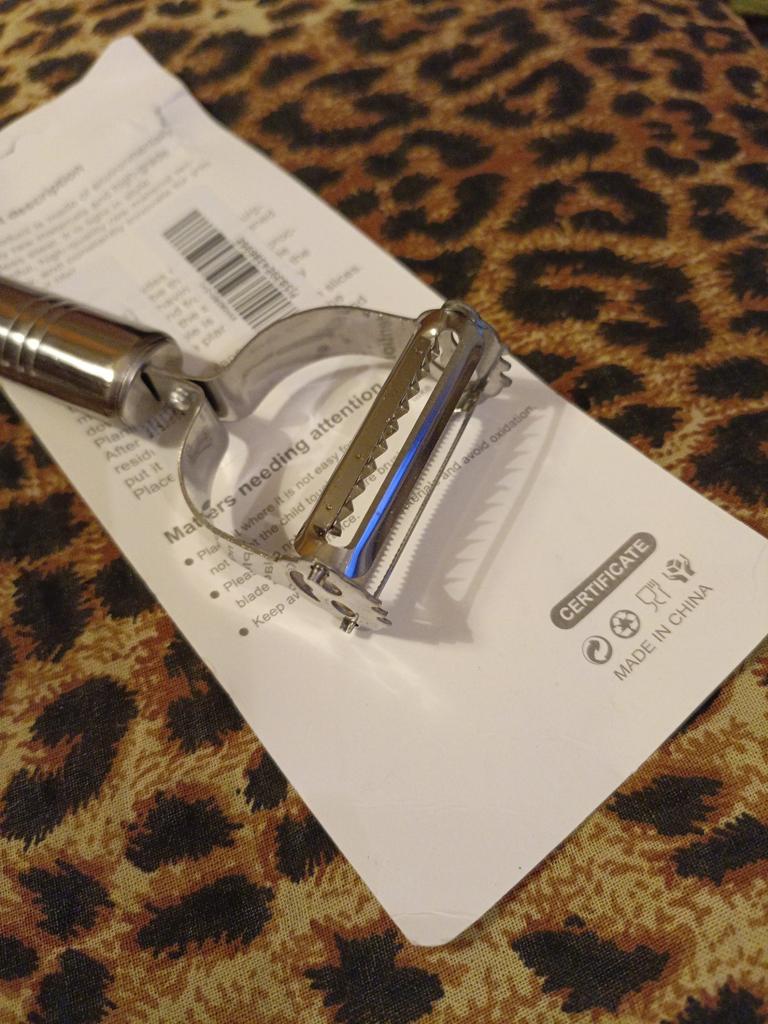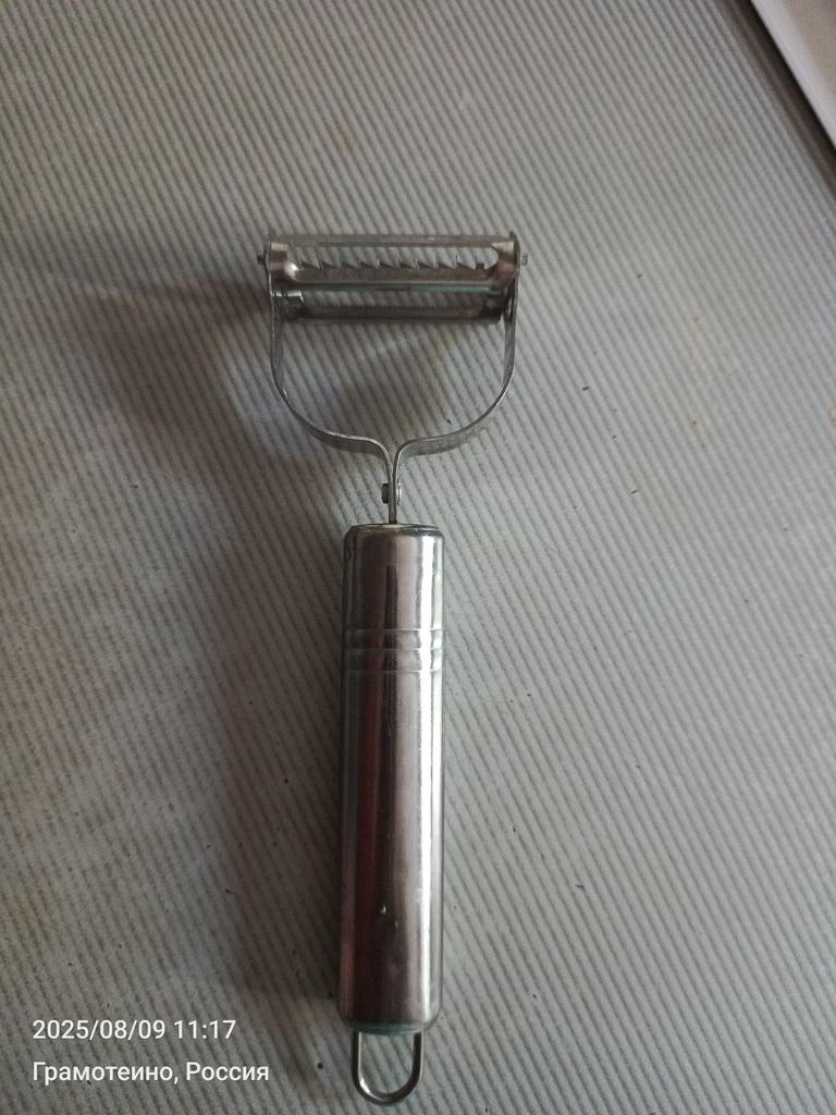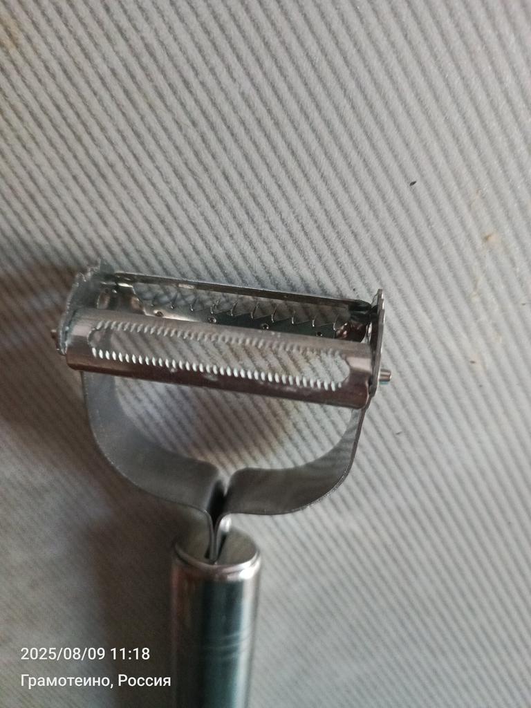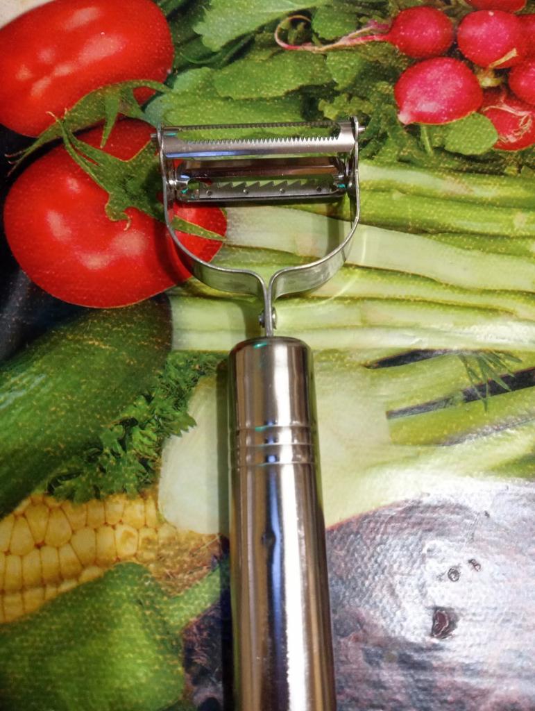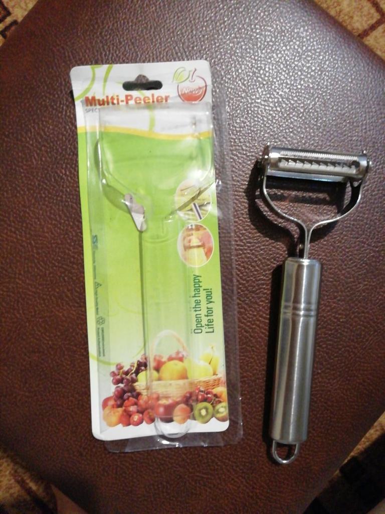 Good, double-sided. . One side peels and slices flat sheets, the other cuts into julienne strips. . Thank you for the gift! Like it !