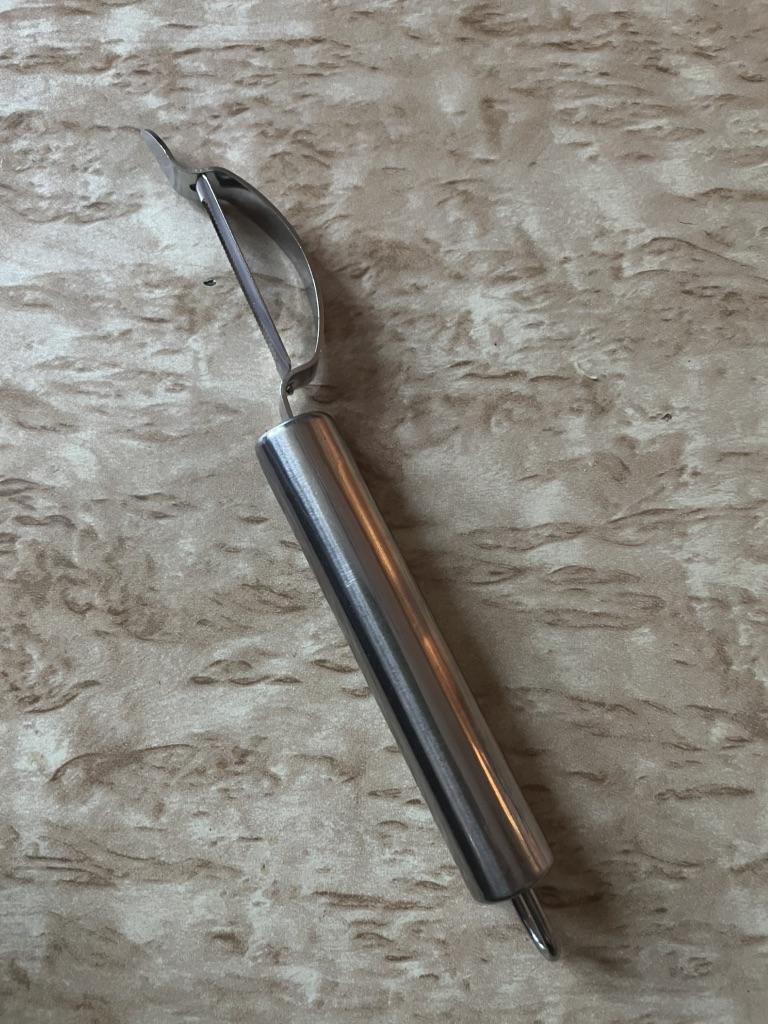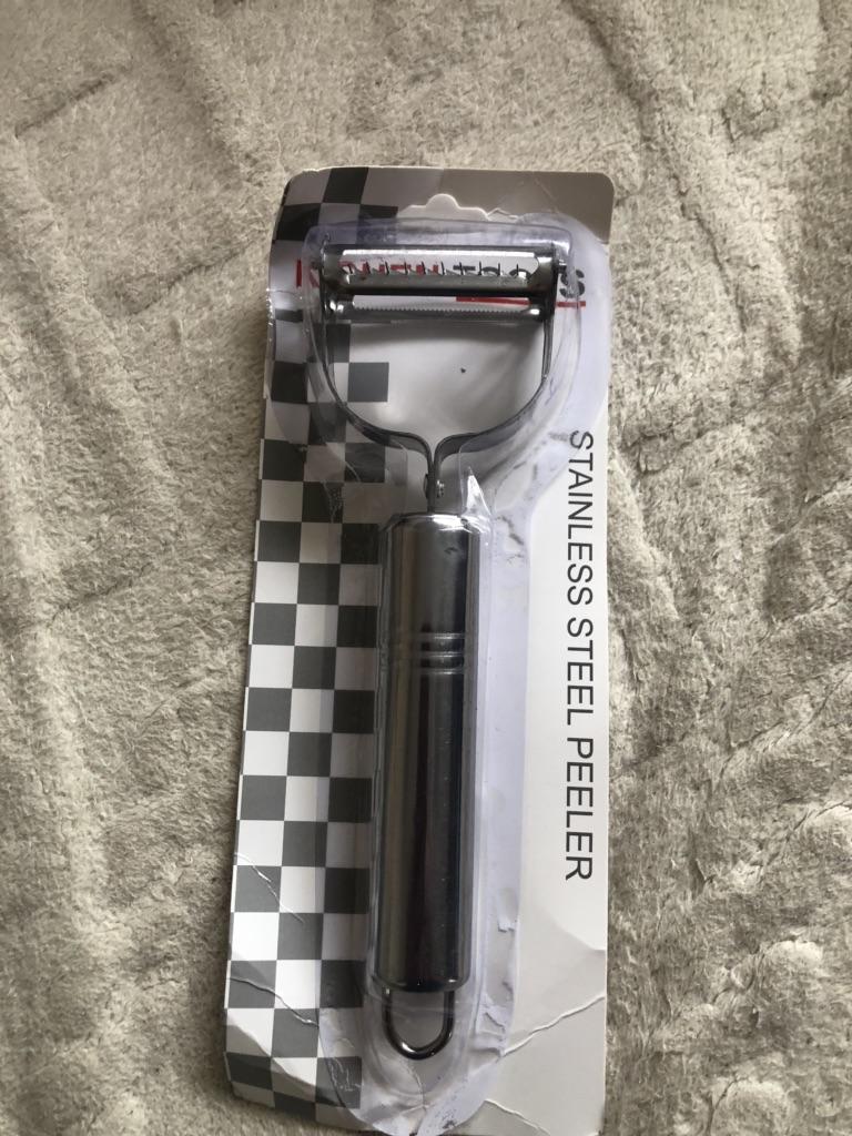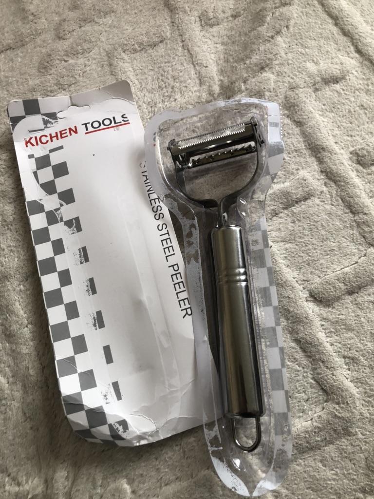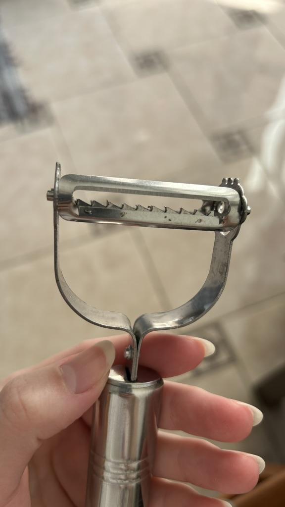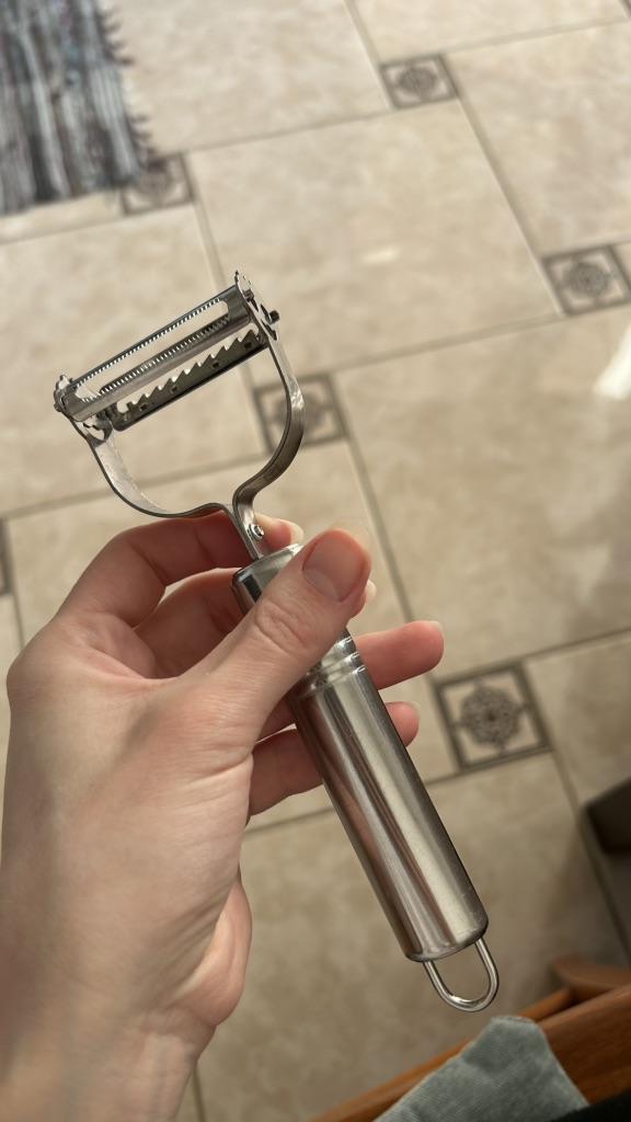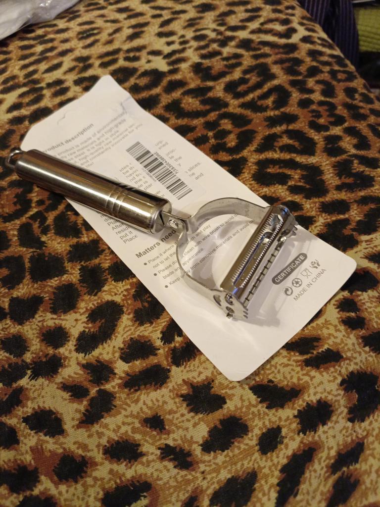 Good, double-sided. . One side peels and slices flat sheets, the other cuts into julienne strips. . Thank you for the gift! Like it !