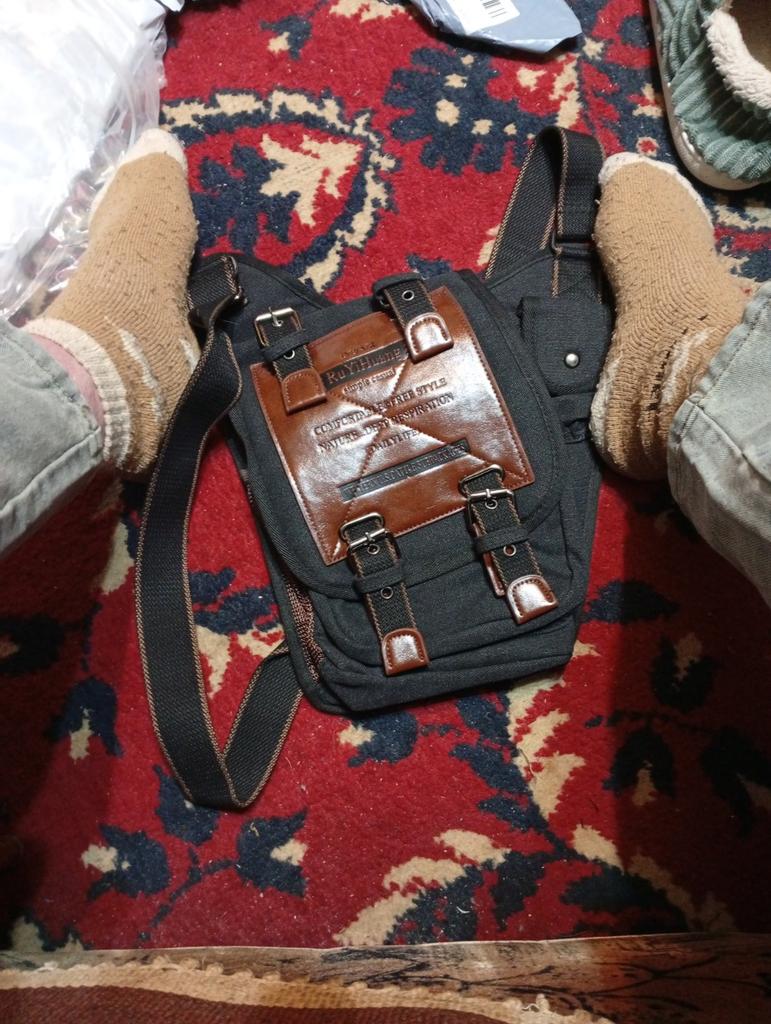 A small bag for everyday use. Keys, phone, charger, umbrella, wallet, small bottle of water. Yesterday at the bus stop I noticed that one magnet on the bag had come off and was lost. The second one is dangling on one whisker. It's not visible under the flap. Otherwise, it seems okay. At this quality, it's a bit expensive.