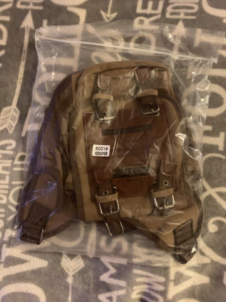Smells like a dead badger. Zipper is broken. Tarpaulin. Artificial leather