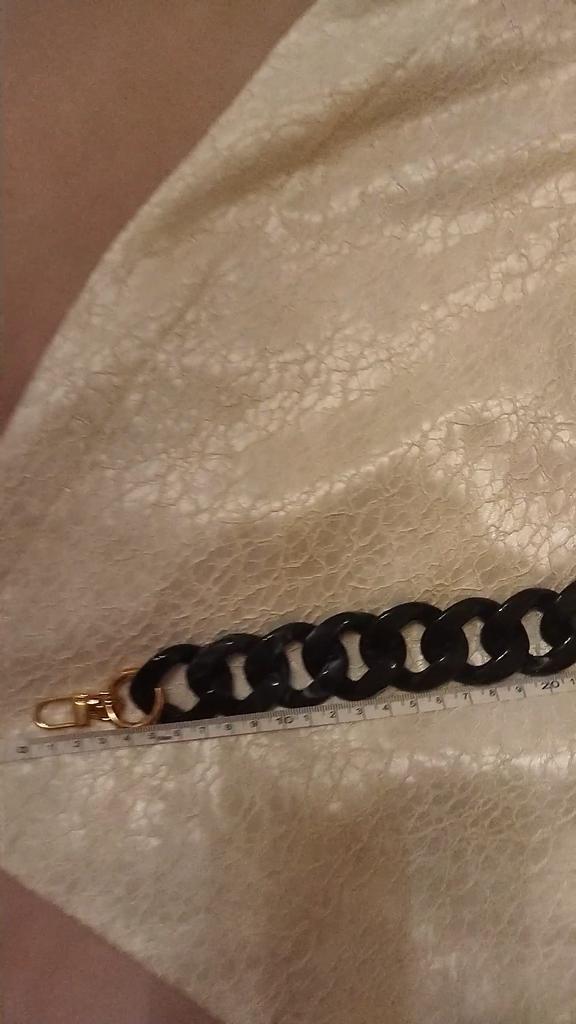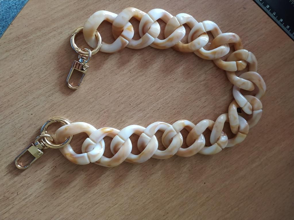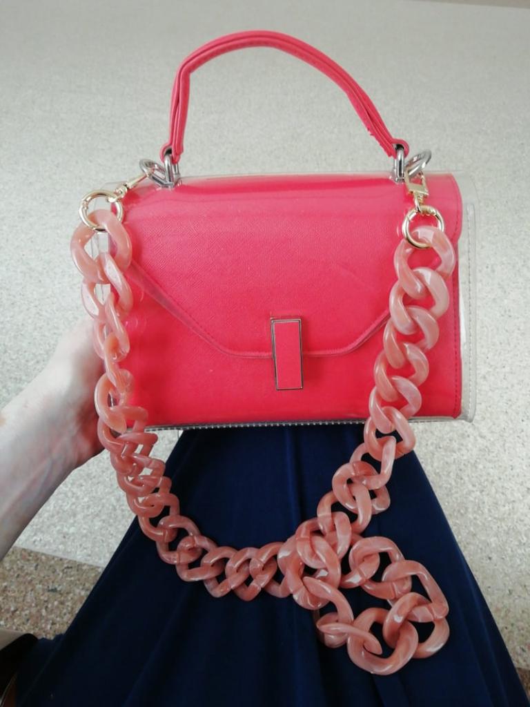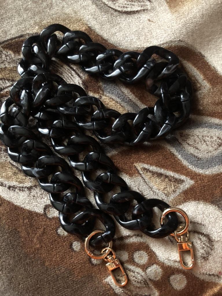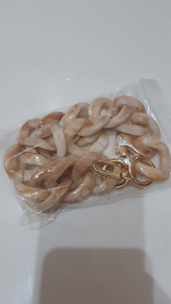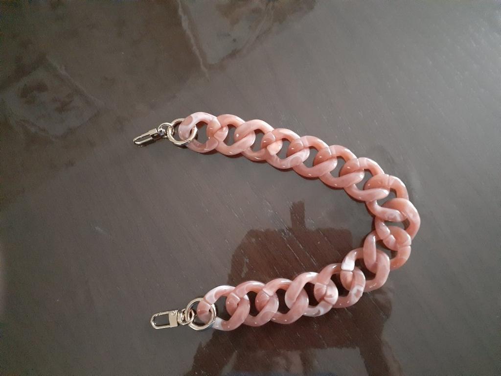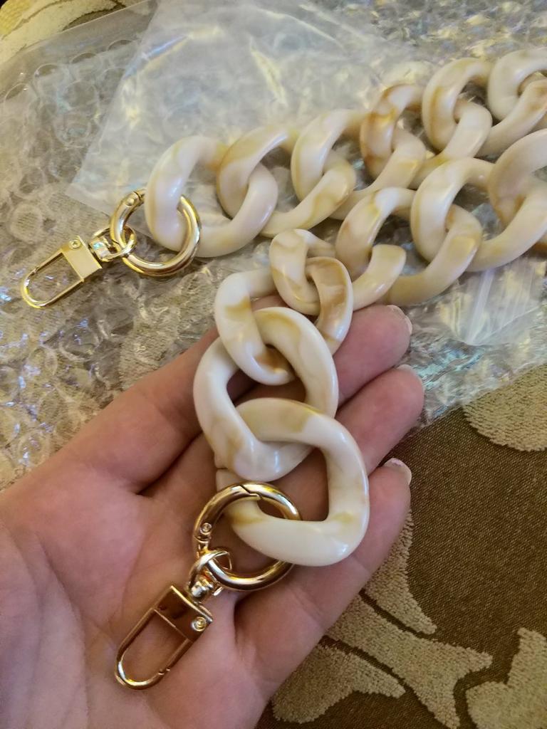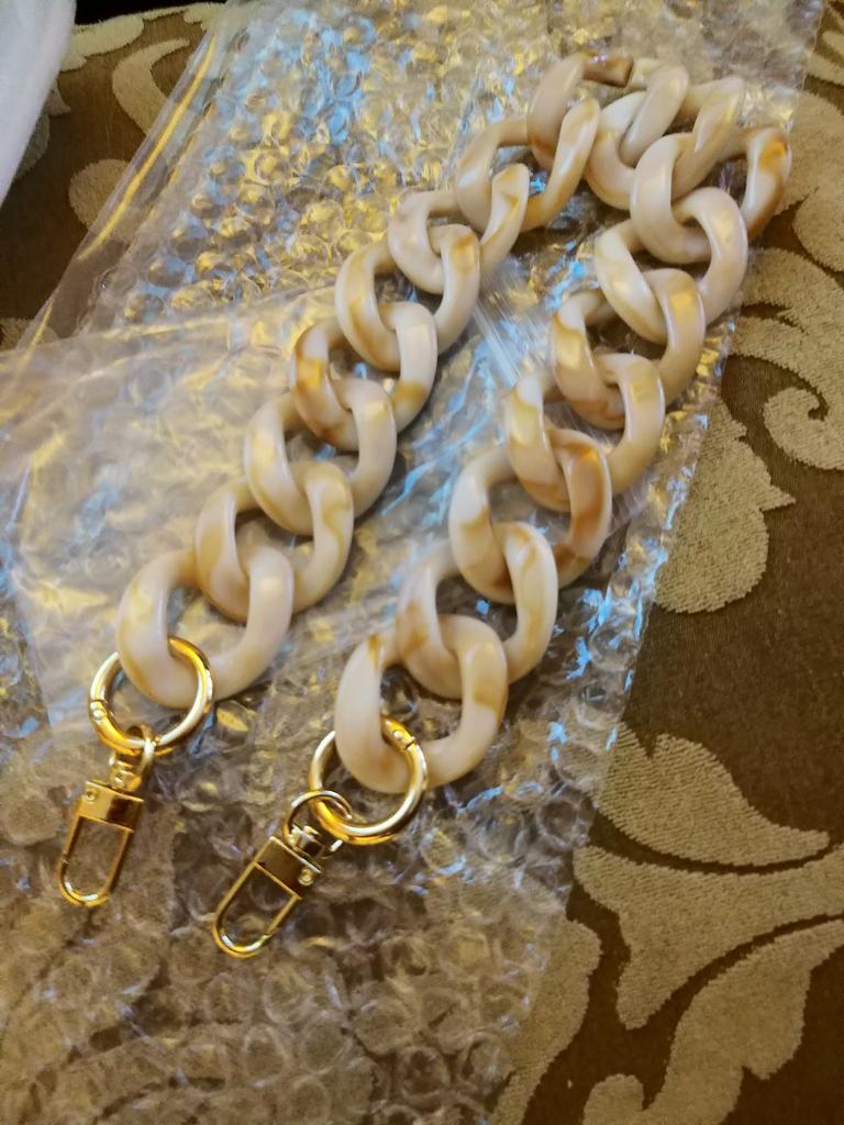 Received a replacement bag chain. The chain is acrylic, beautiful, but the pink color is more like beige. Didn't fit for me. I recommend you are lucky.
