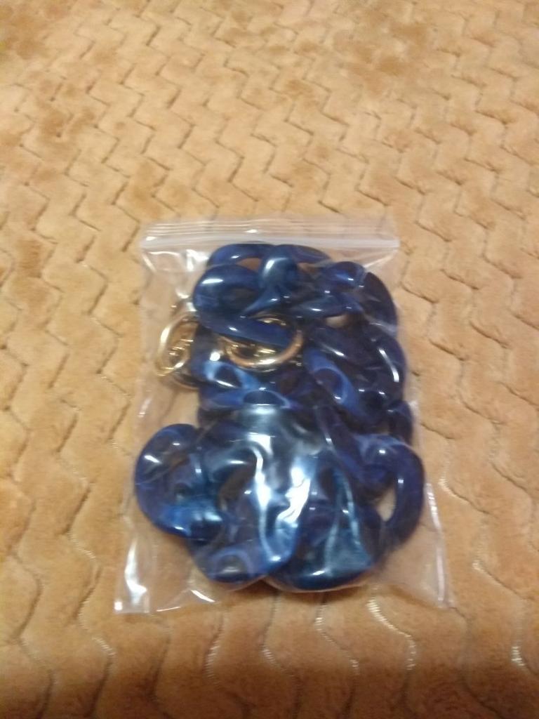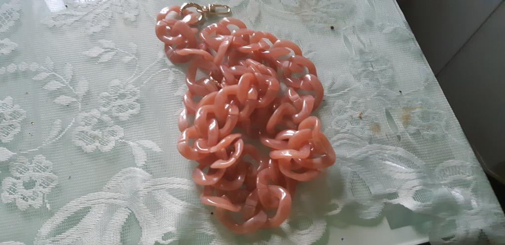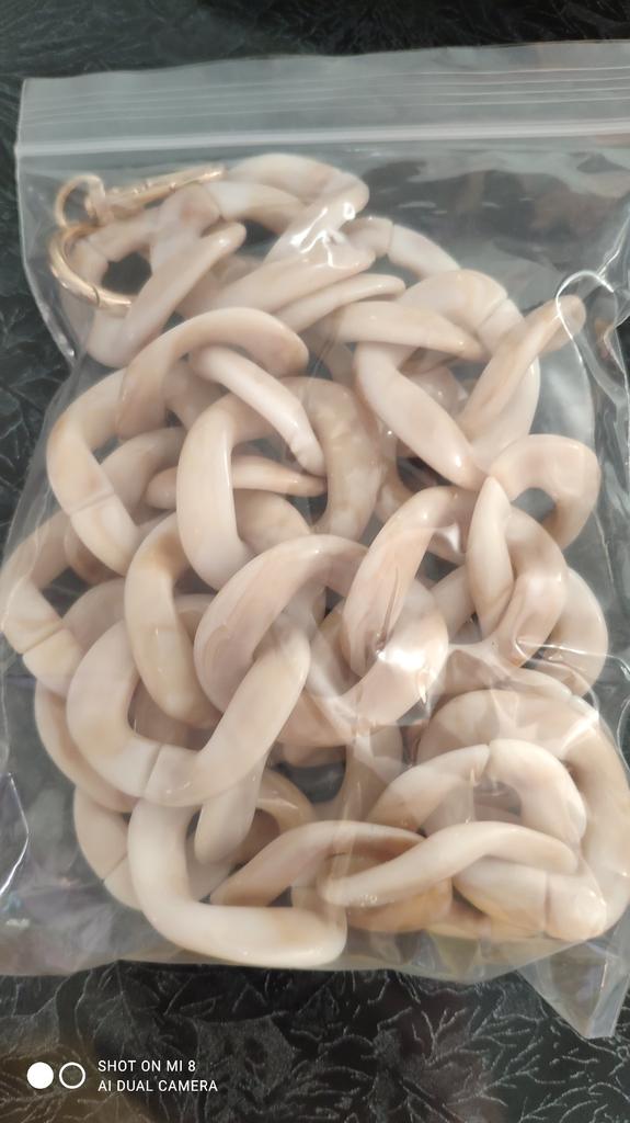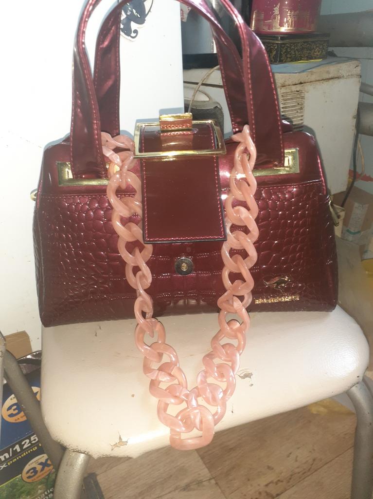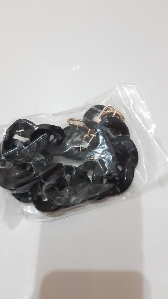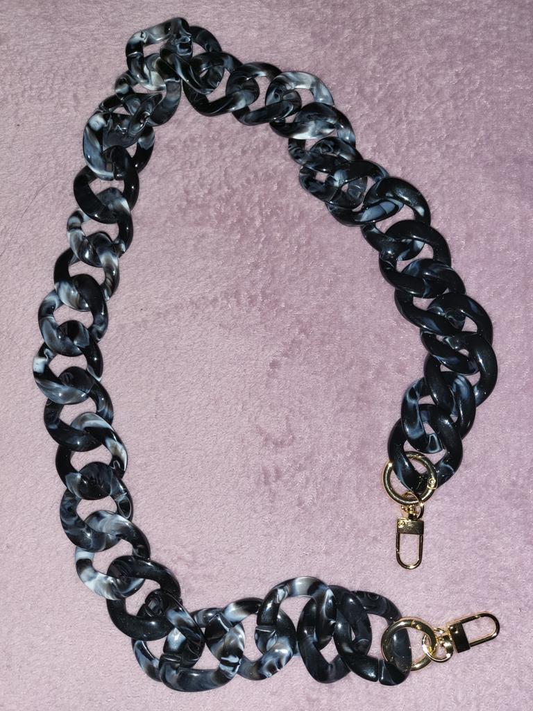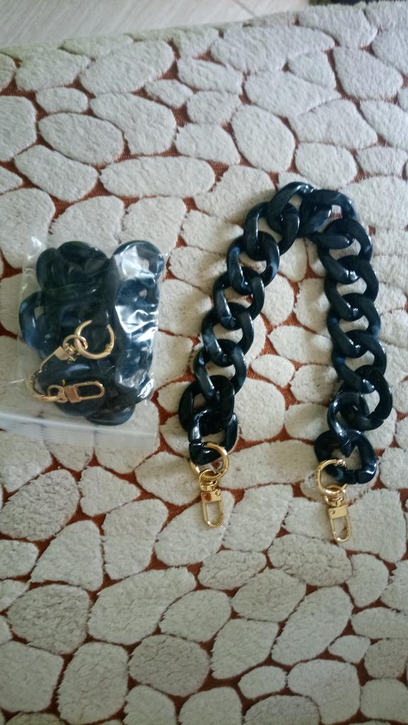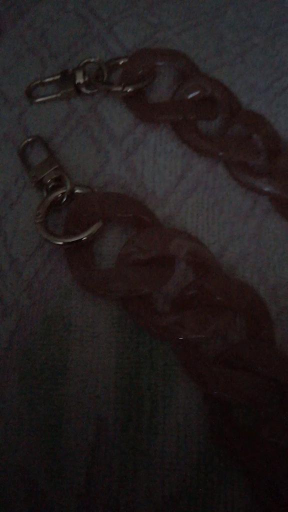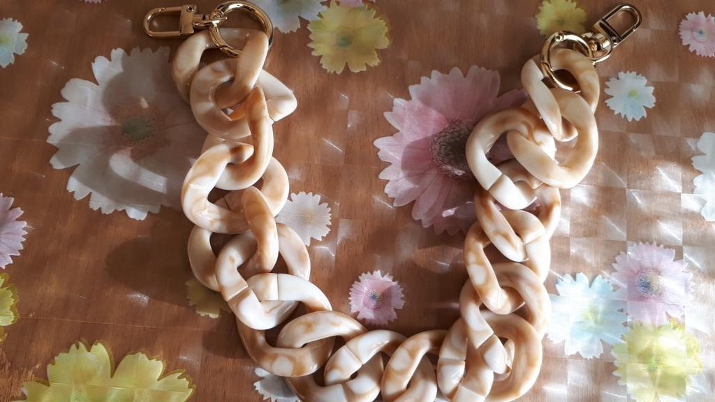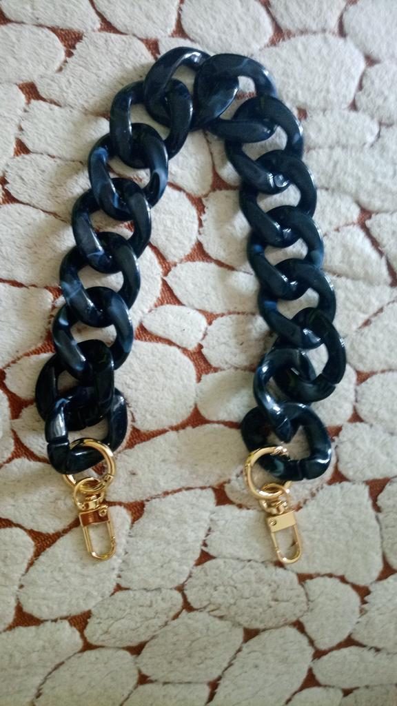Received a replacement bag chain. The chain is acrylic, beautiful, but the pink color is more like beige. Didn't fit for me. I recommend you are lucky.