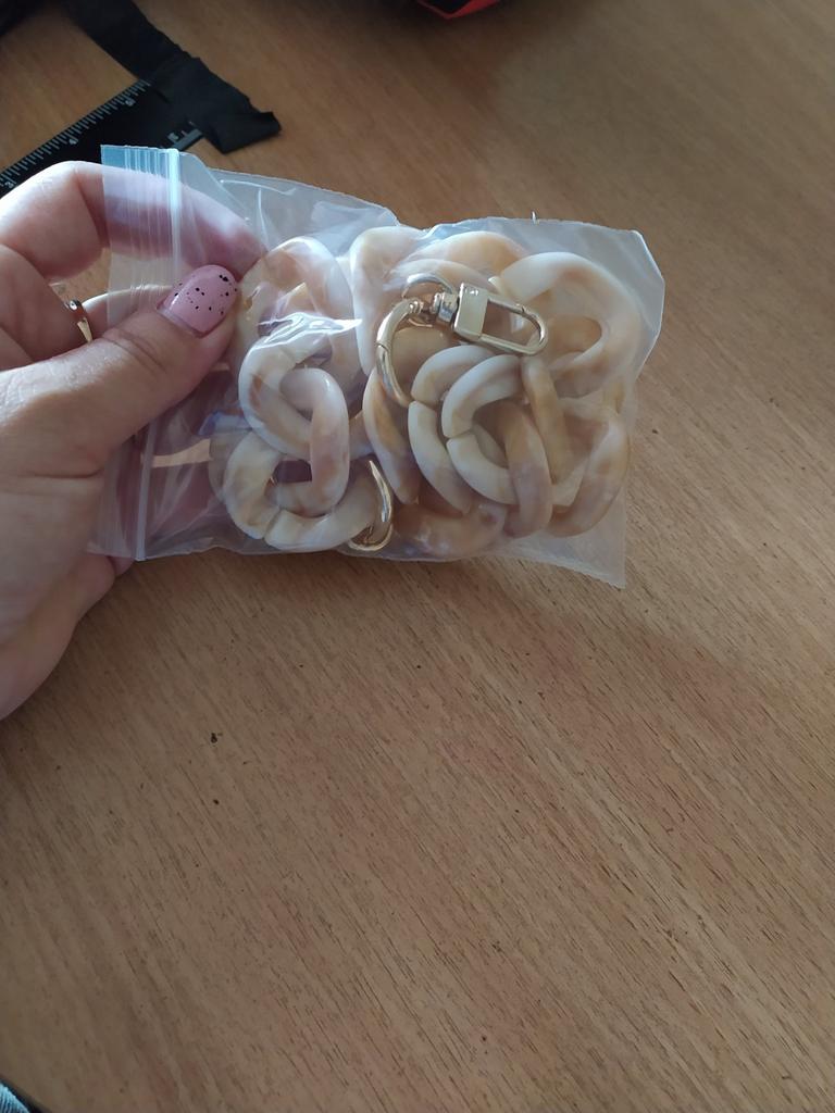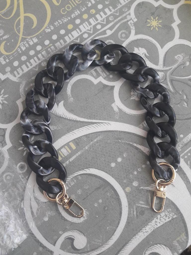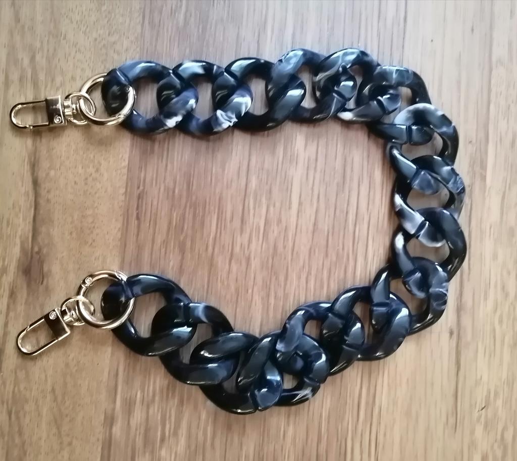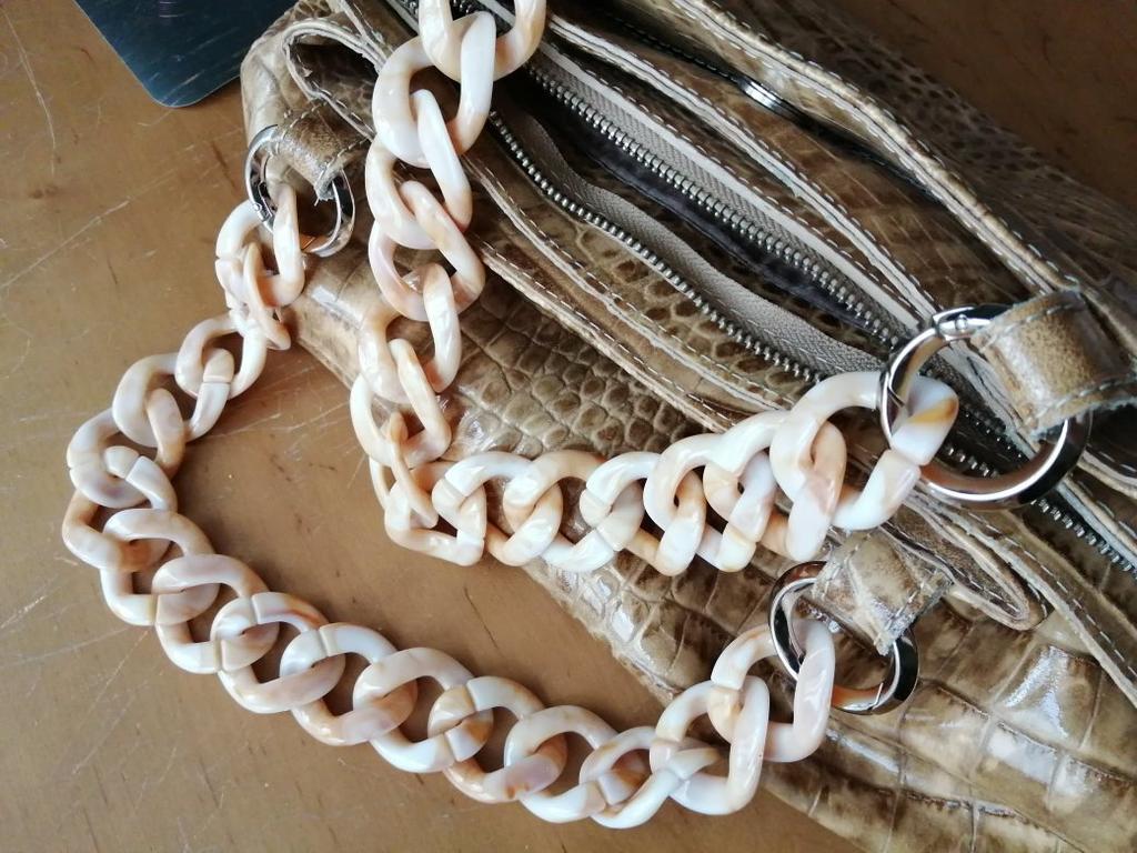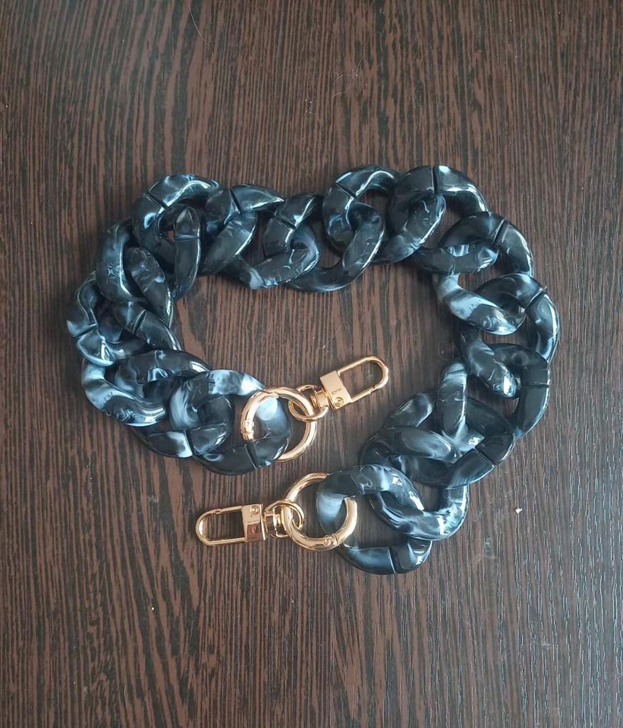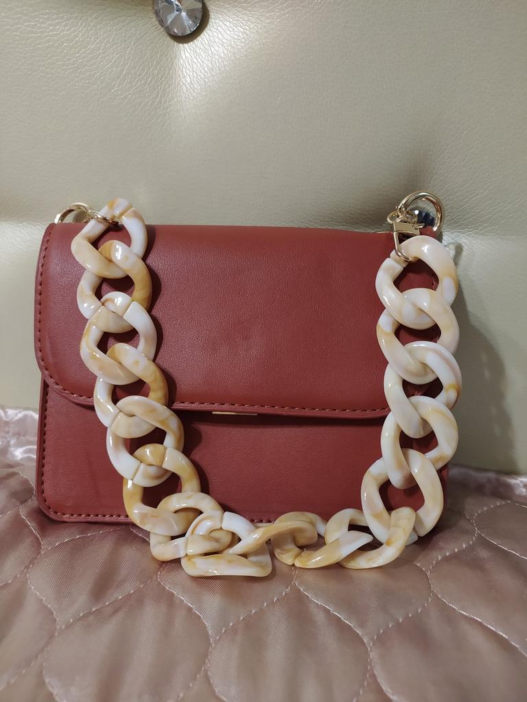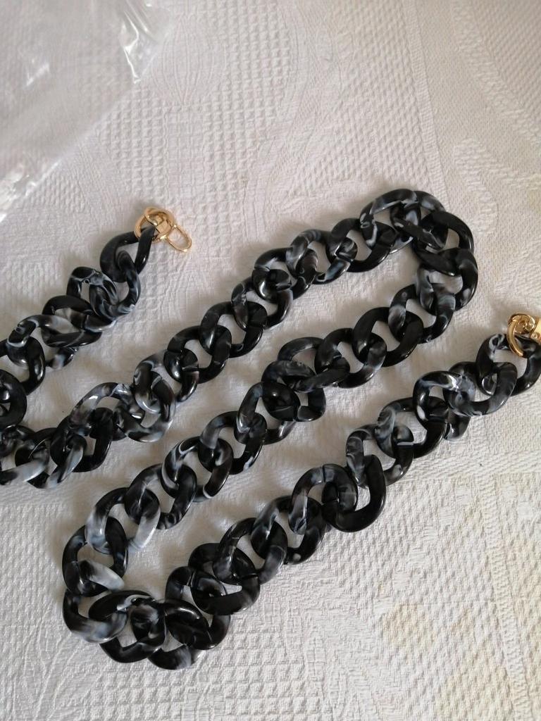 Received a replacement bag chain. The chain is acrylic, beautiful, but the pink color is more like beige. Didn't fit for me. I recommend you are lucky.