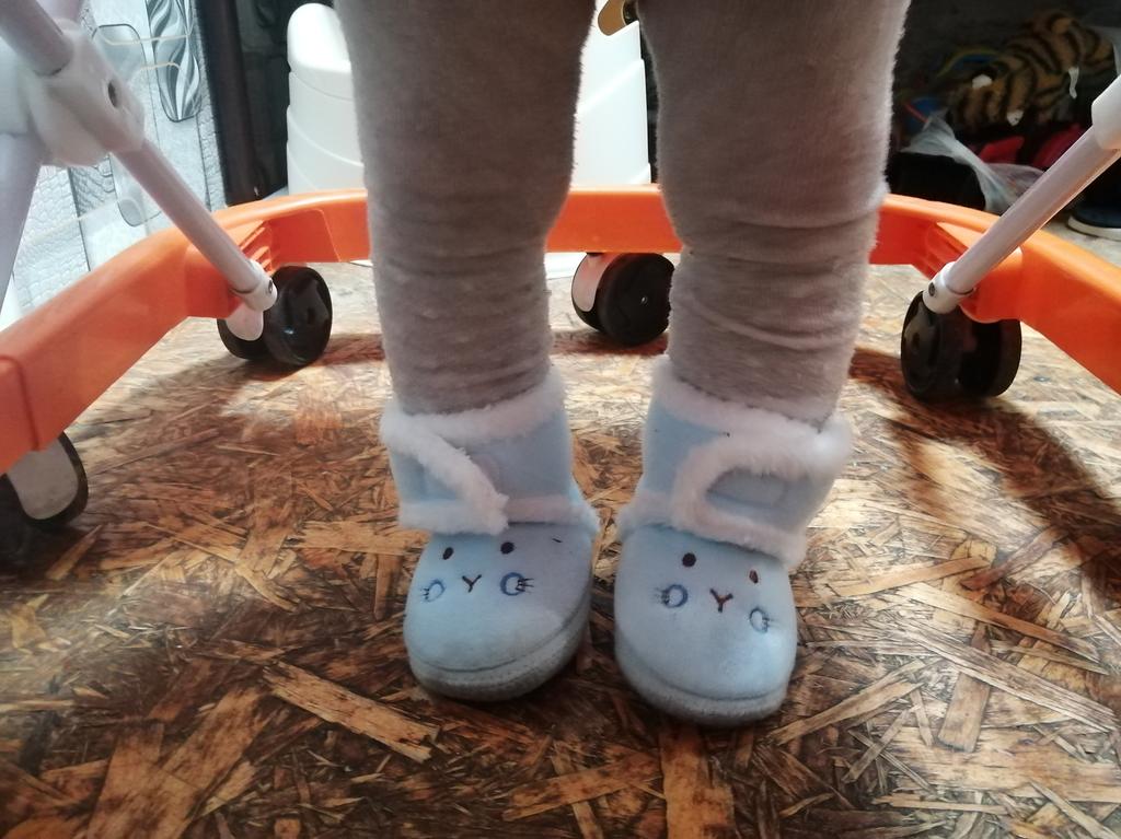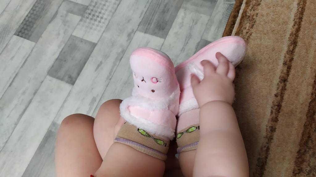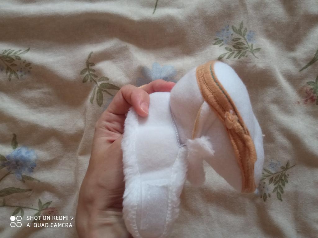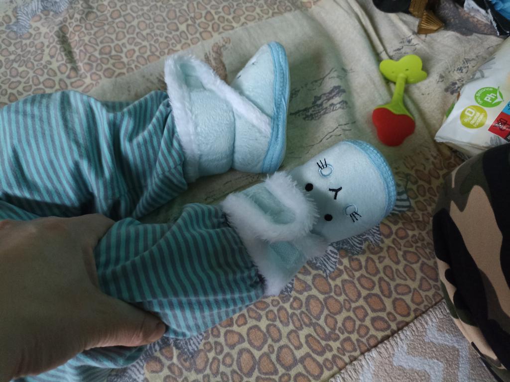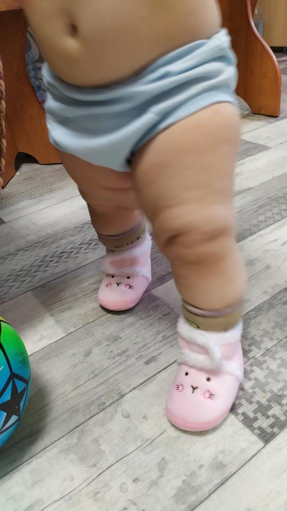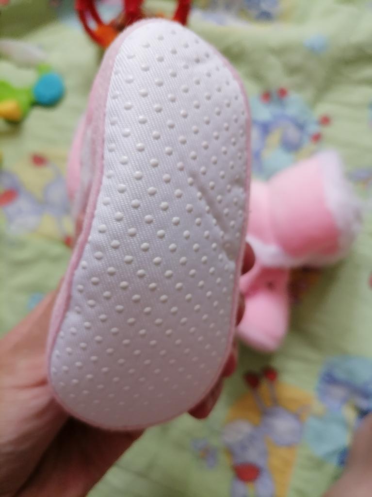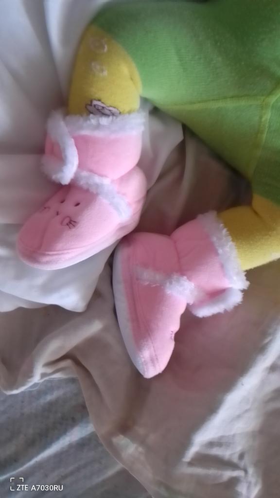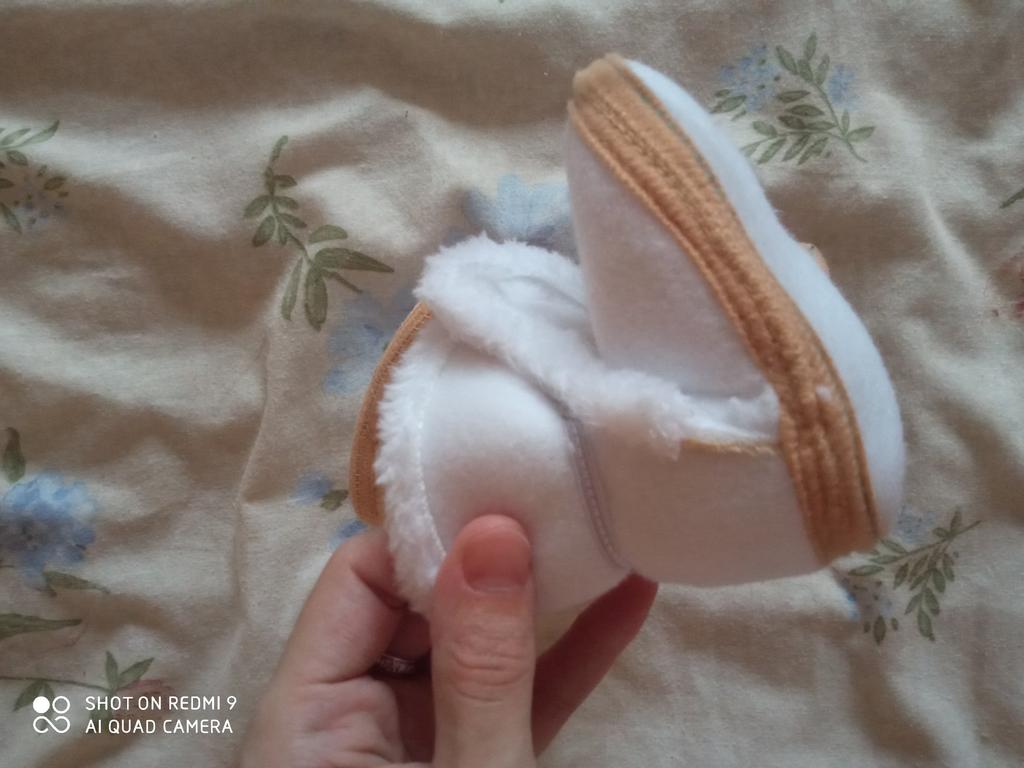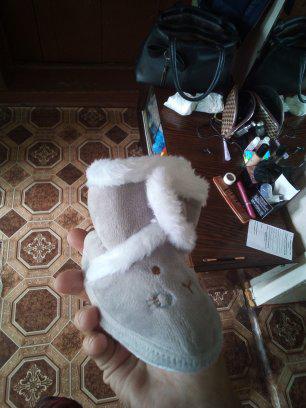 The boots are lovely. Soft, fastened with Velcro. An elastic band is sewn inside above the heel so that it does not slip when moving your legs. The sole is thin, with anti-slip pimples. They haven’t measured it yet, they were just born.