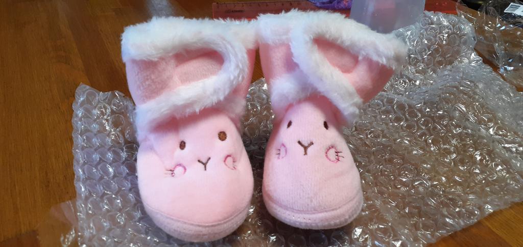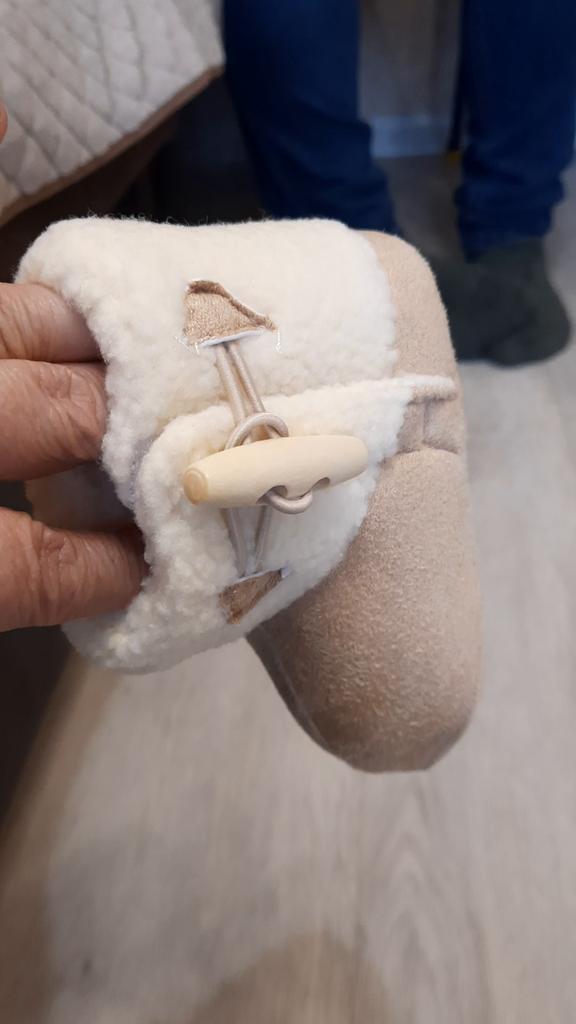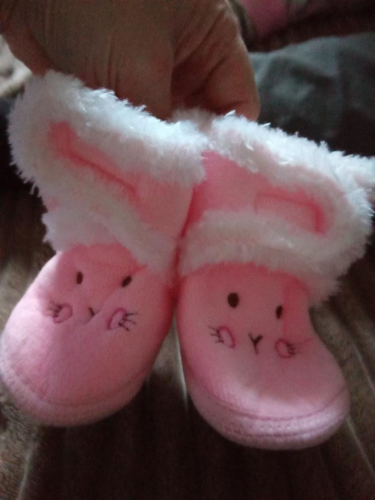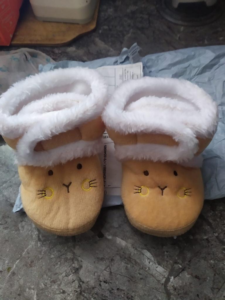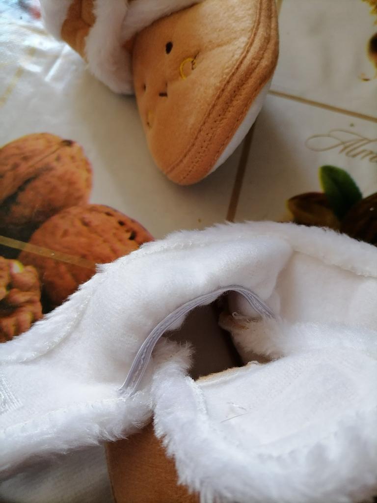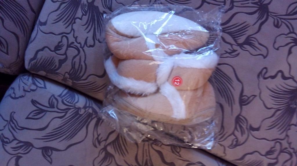 We waited. Great home shoes. Soft, slightly warm. Rubber inside. I ordered a size larger, but while we waited, the boots also grew up for us.
