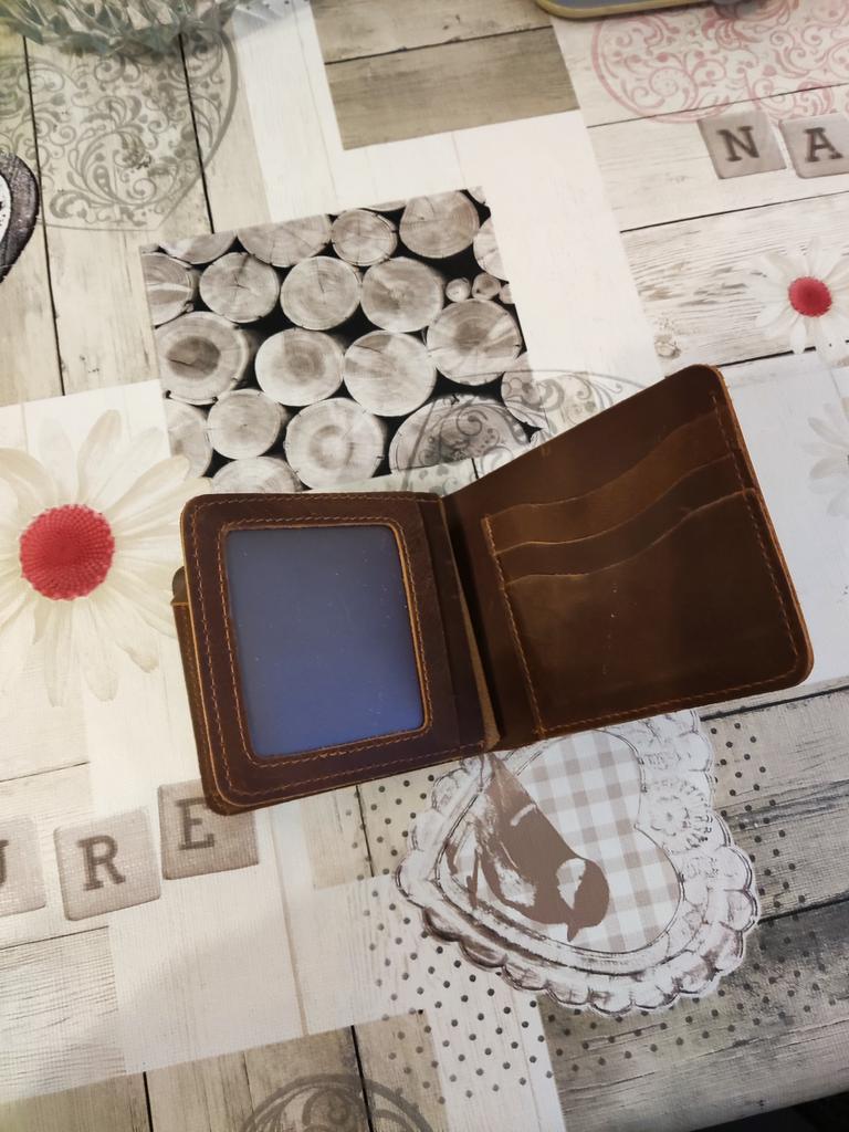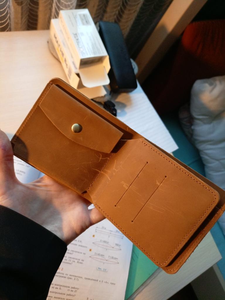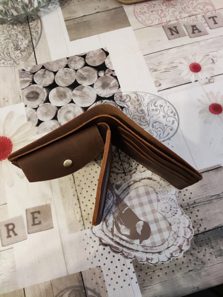 The wallet is made of genuine, very durable leather, with convenient compartments for paper bills and bank cards, a normal compartment for coins, and since it is made of a straight strip of thick leather, it does not stretch much. Overall, I am satisfied with the wallet, I did not find any flaws.