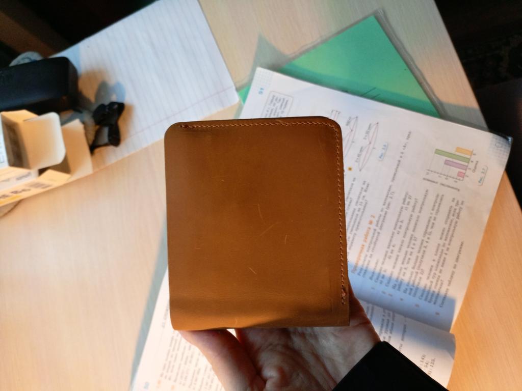 Leather spatula, unlined. One compartment for banknotes, a pocket for coins and 8 compartments for cards, including one for photos. Natural minimalism is SUPER!