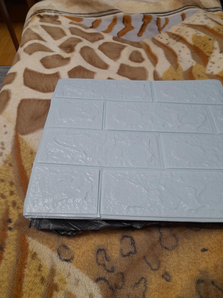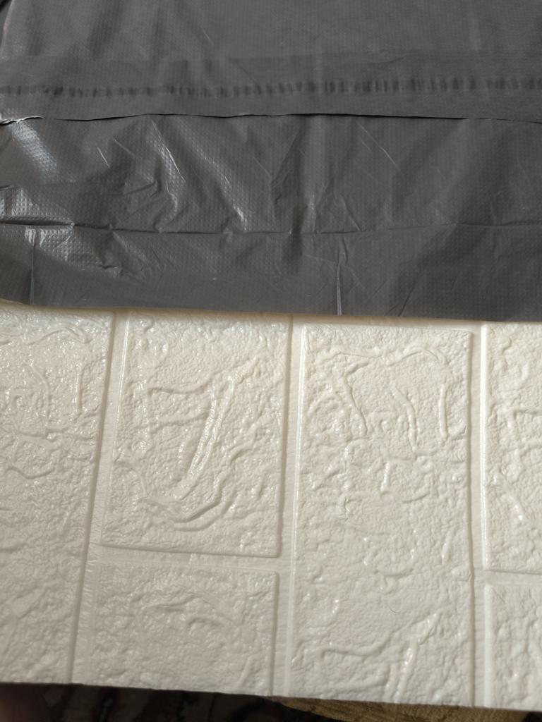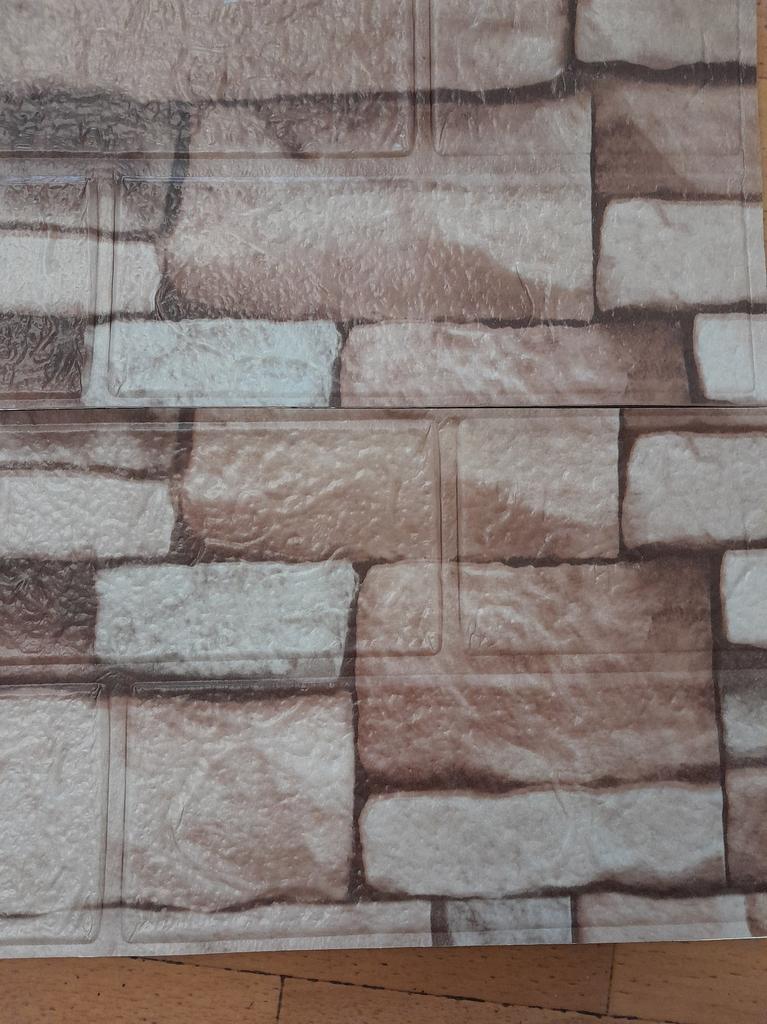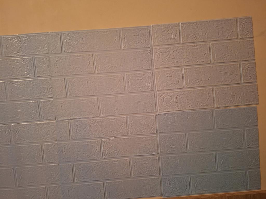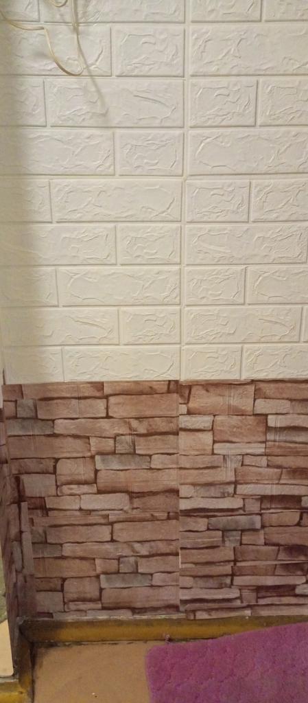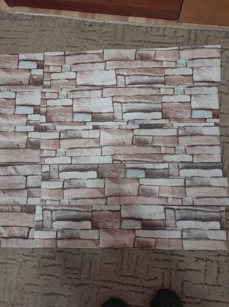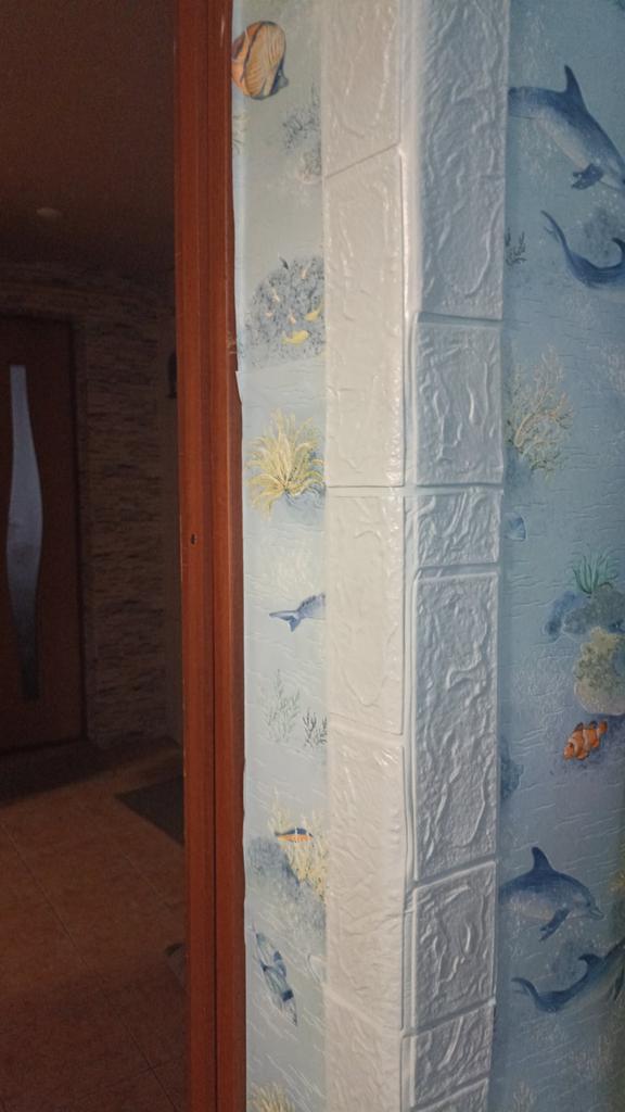 The stickers are very delicate with a brick effect. When removing the transparent protective film, you must be careful - the glue sticks to everything: clothes, hair, hands... - it is difficult to peel off, because the "bricks" themselves tear and deteriorate. I pasted it on the wallpaper - it holds up well, it won't work to re-glue it in the unevenness) Therefore, crookedly, that's how it will be.