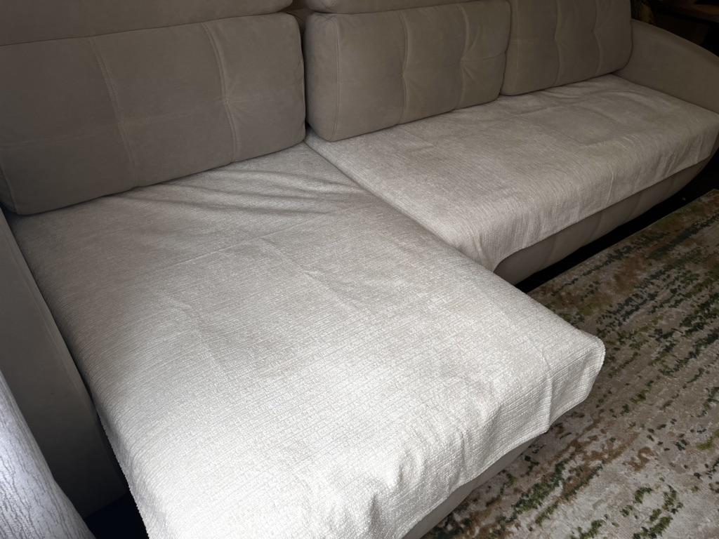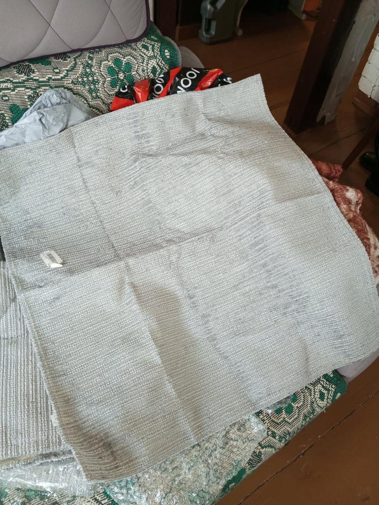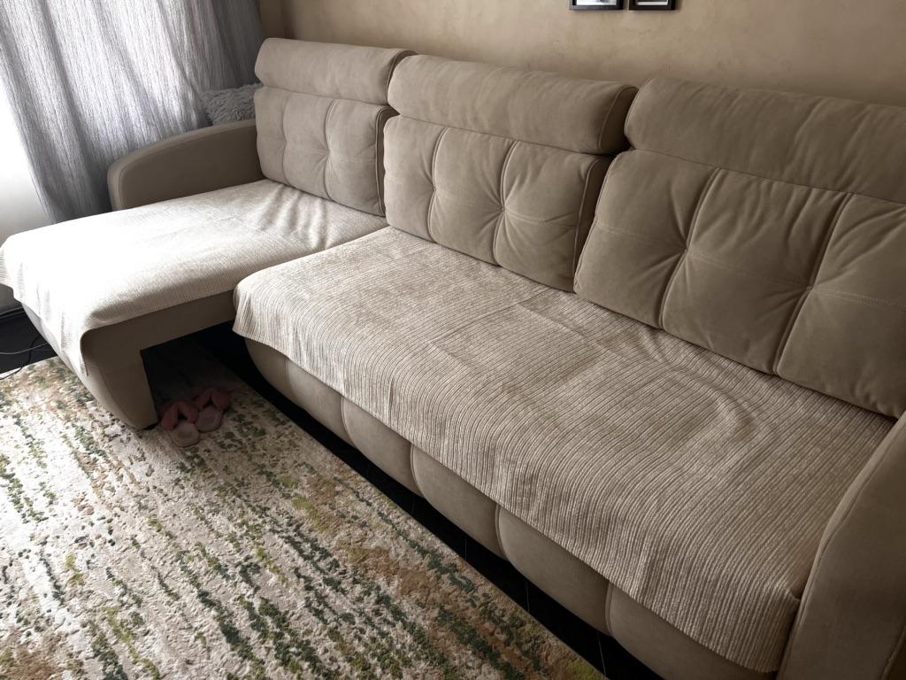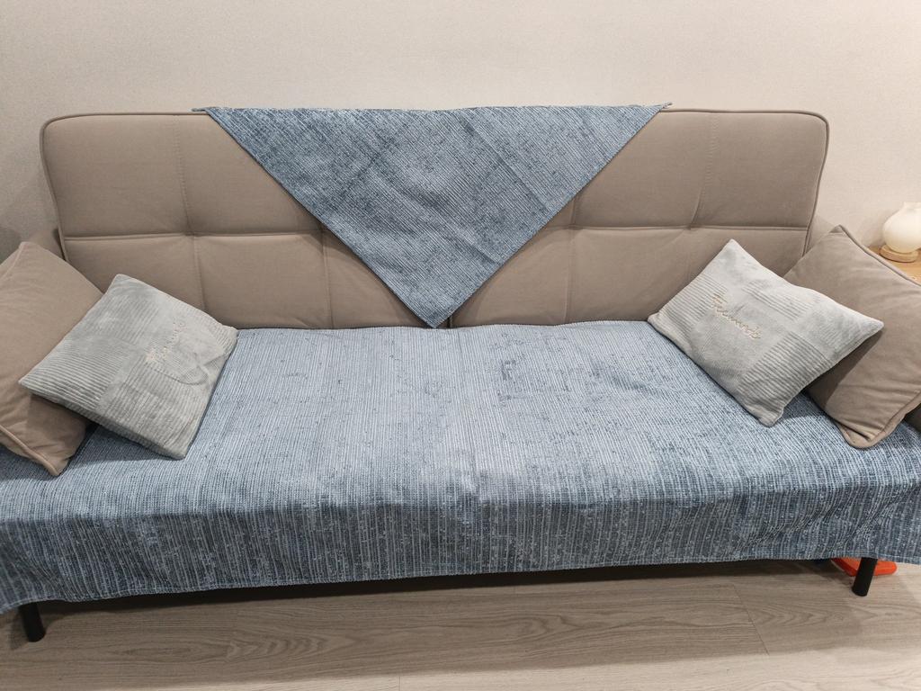 The color is much lighter than in the photo, it didn't suit me at all. It doesn't slide down, but it gathers into folds on the sofa. Pleasant to the touch