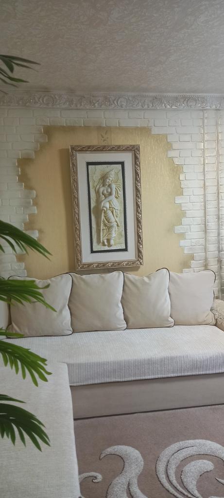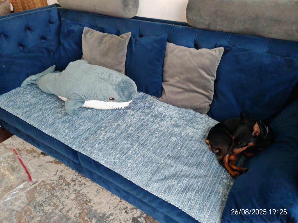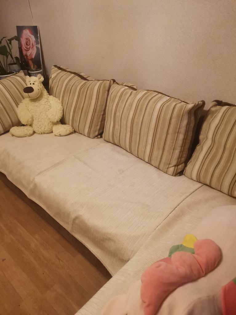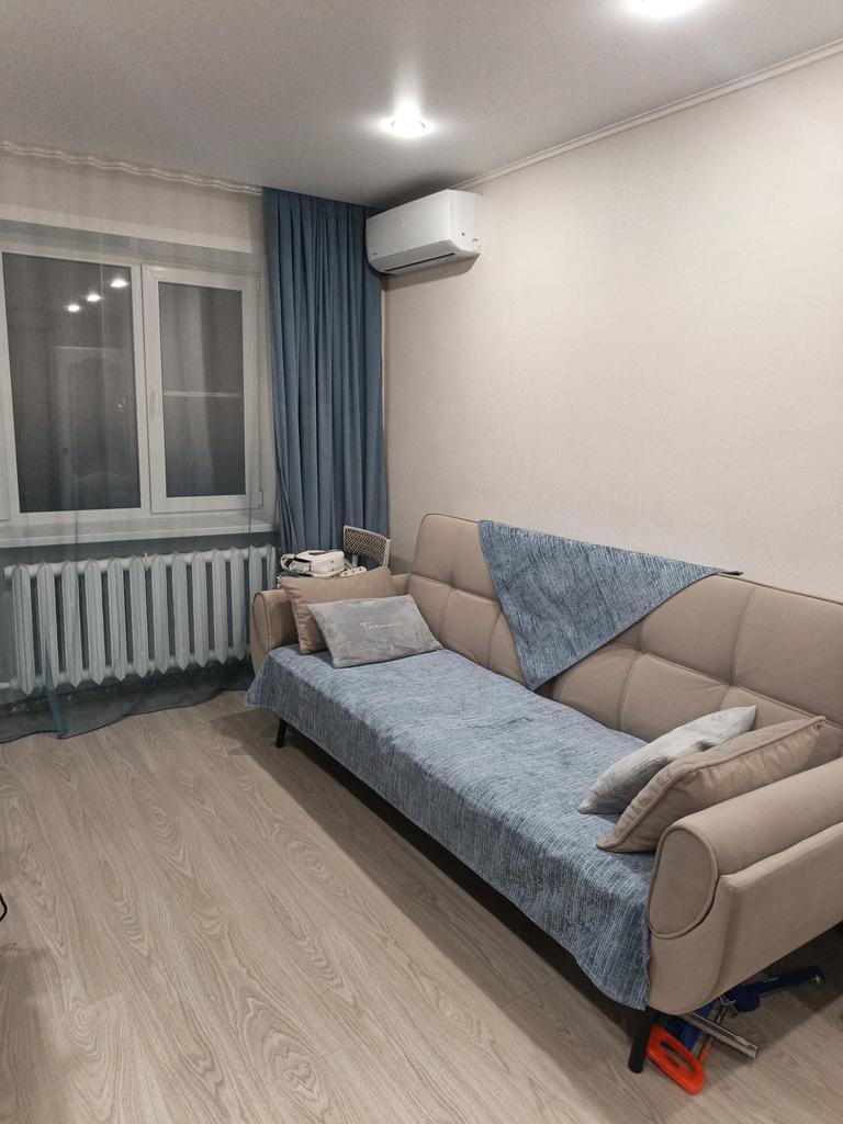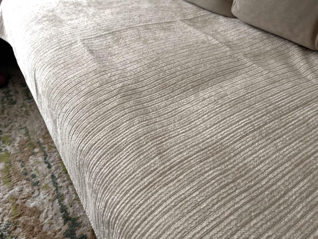 The color is much lighter than in the photo, it didn't suit me at all. It doesn't slide down, but it gathers into folds on the sofa. Pleasant to the touch