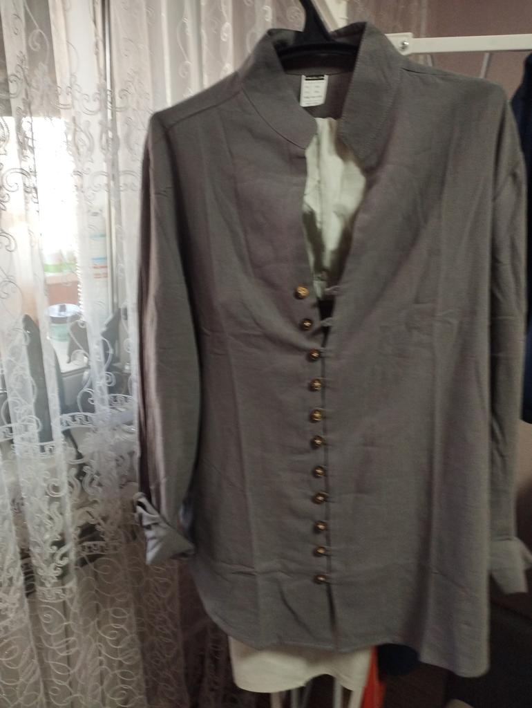 XL corresponds to size 50, sleeves are of normal length, the fabric is more like linen as in the picture.