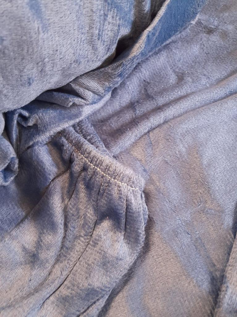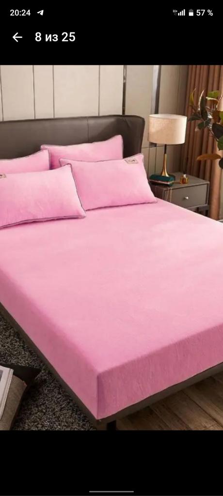Plush blanket with elastic band, nice to sleep on. The color matches the headboard. Mine is dark lilac. Everything is super.