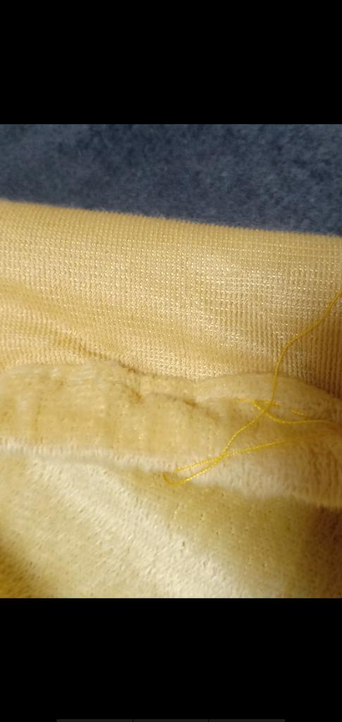 The color is not yellow, but clearly mustard. Sewn normally.