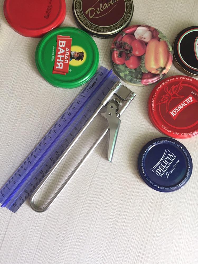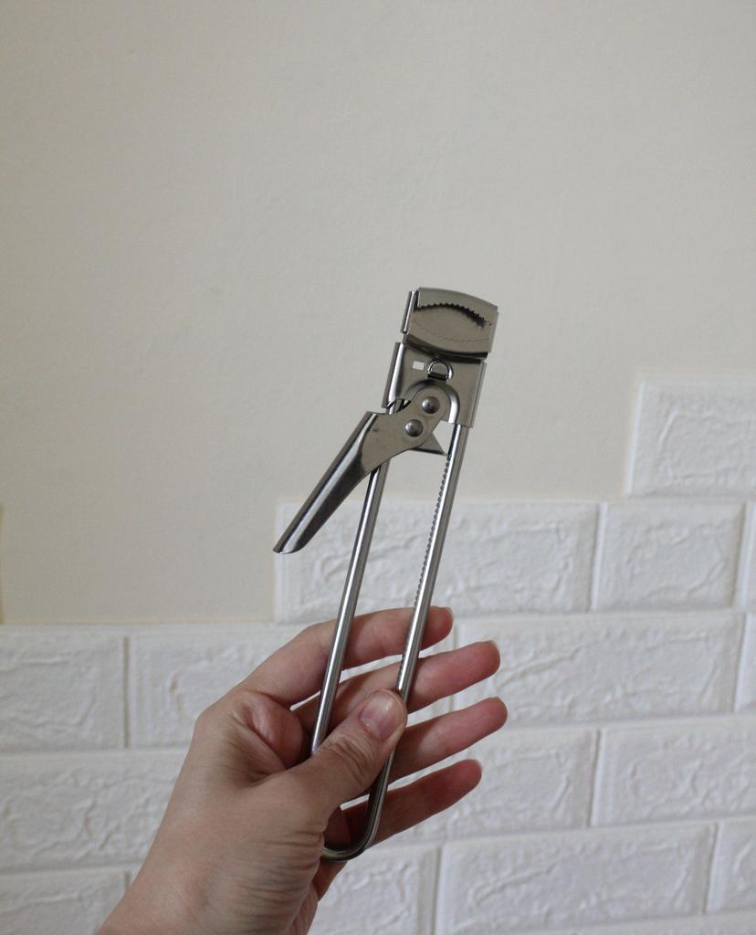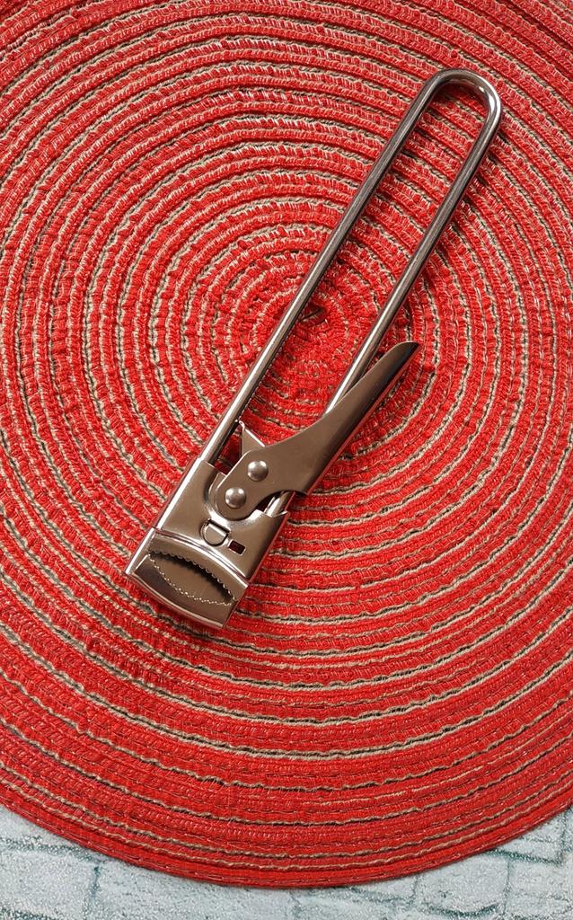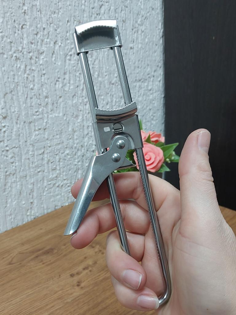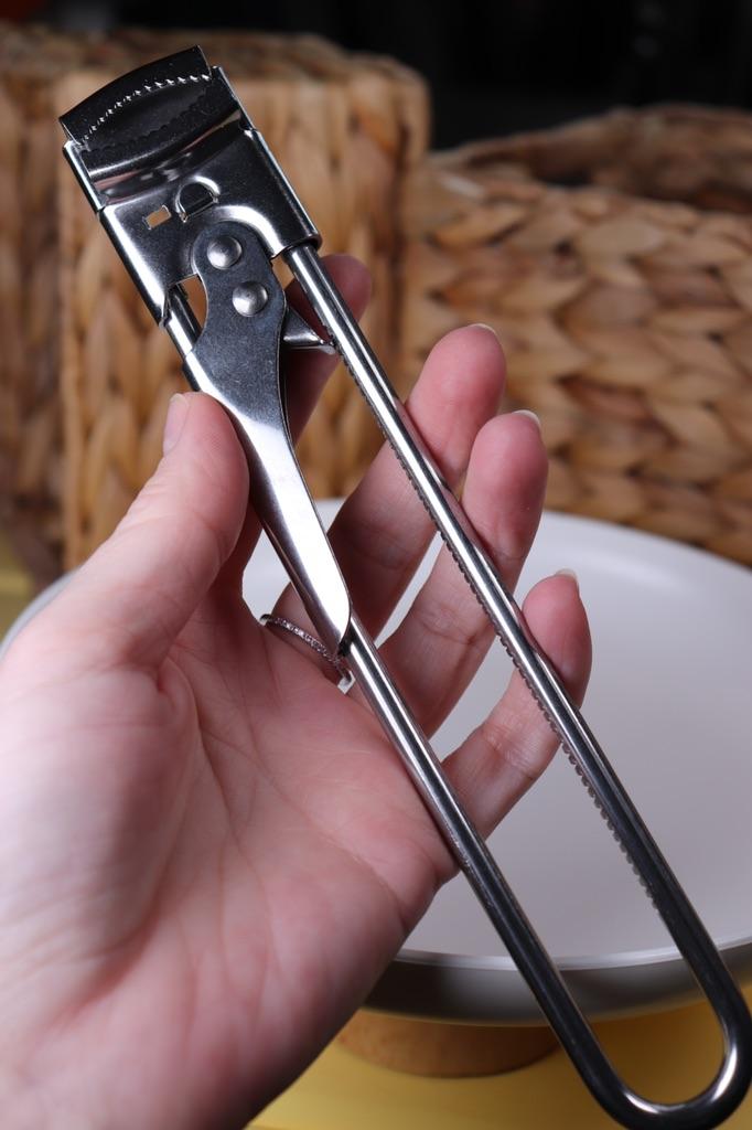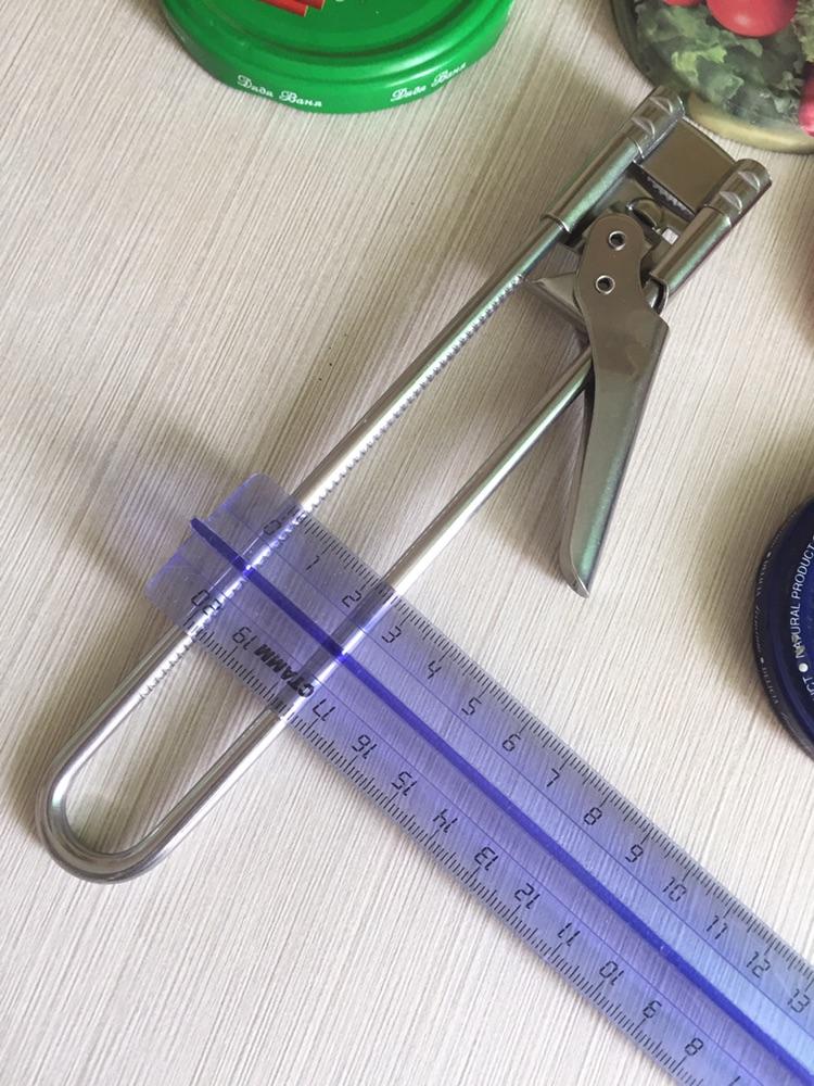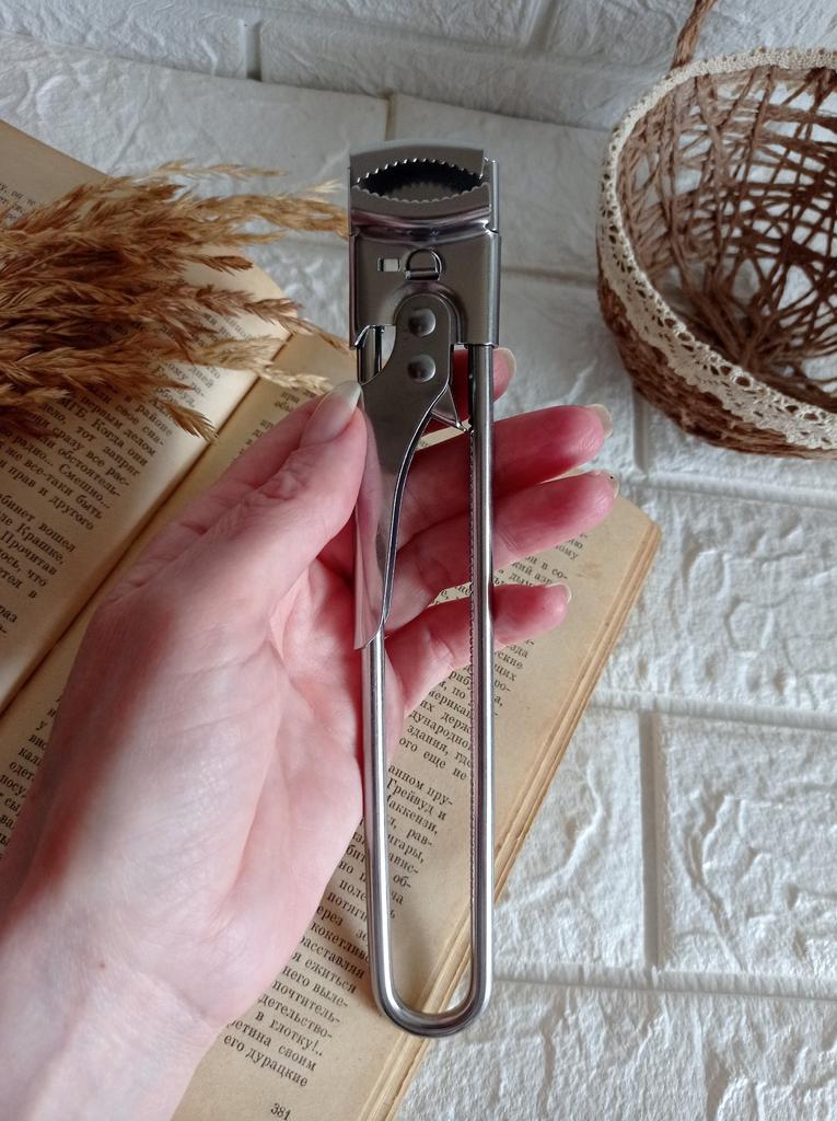 Can opener Adjustable design to fit most bottle sizes. Made of stainless steel. Size: 19cm x 3.3cm Must open cans with canned goods, bottles with drinks and other containers. You just need to clamp the lid with your teeth and press the handle, the lid rises and it is easy to open with your hands. But there is a minus: the metal structure presses the lids so that it makes dents and peels off the paint.