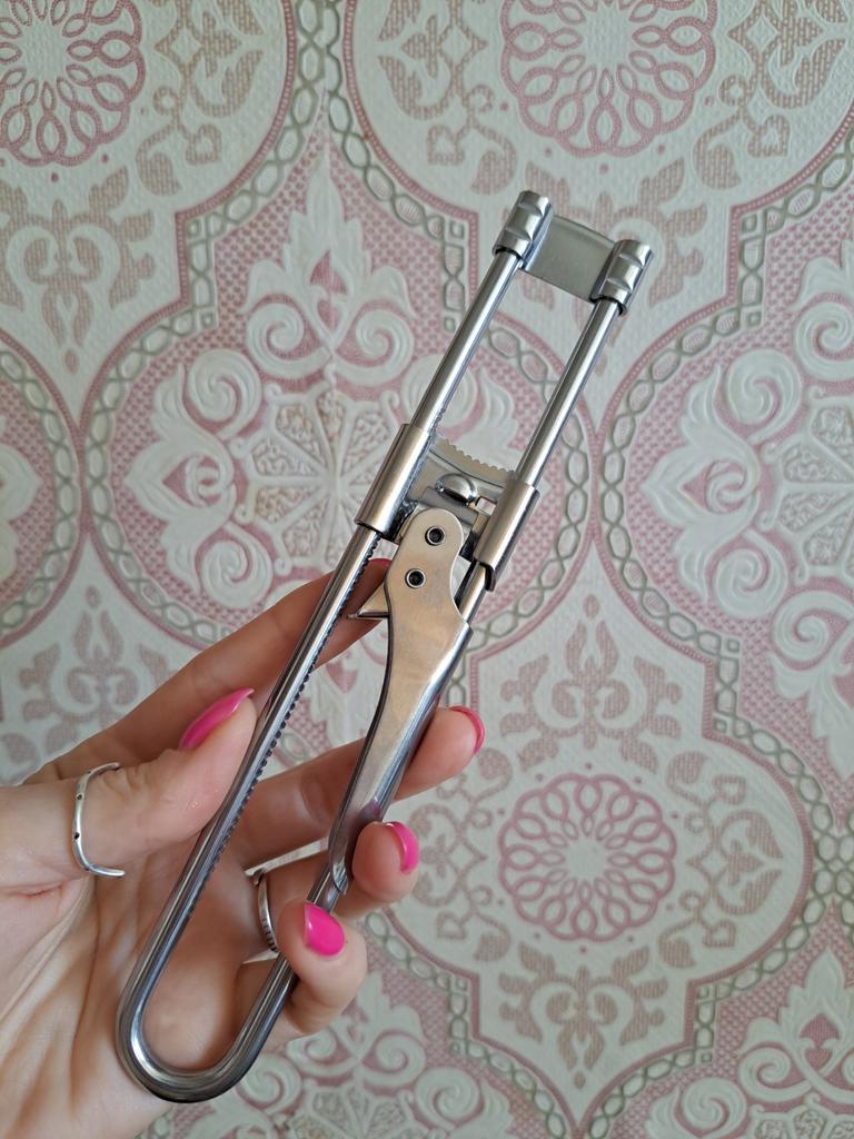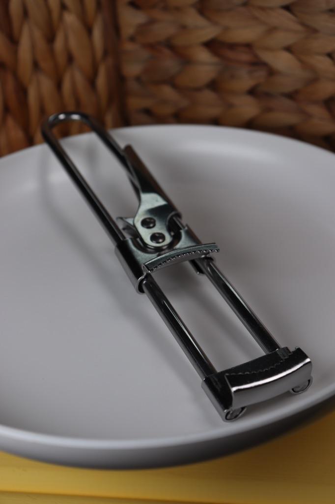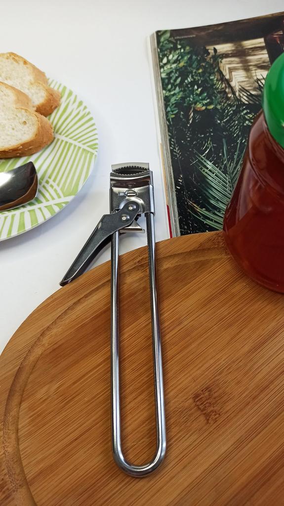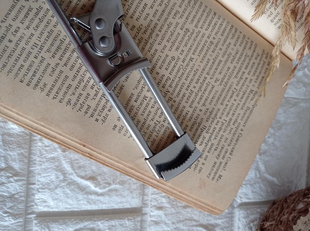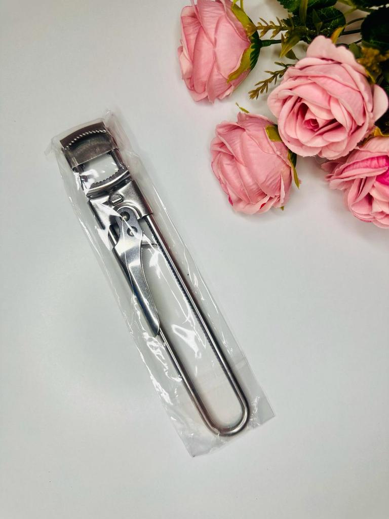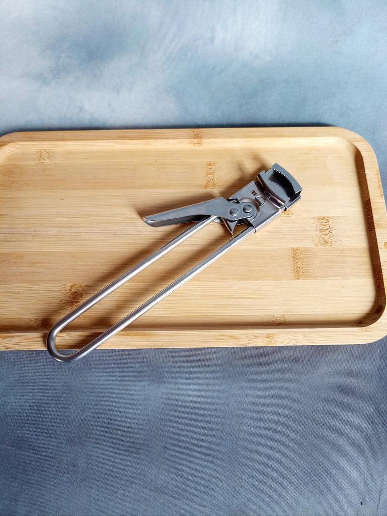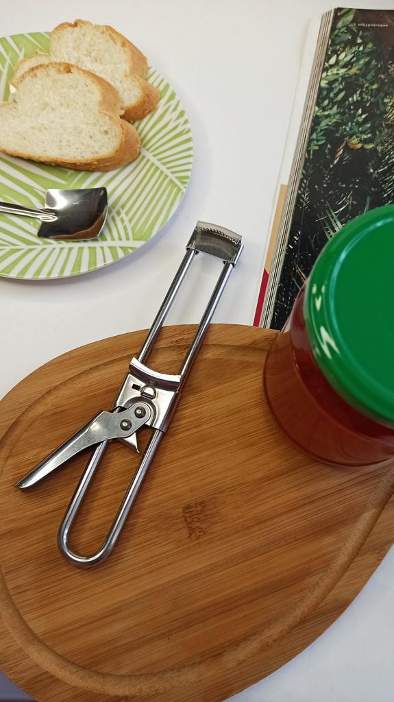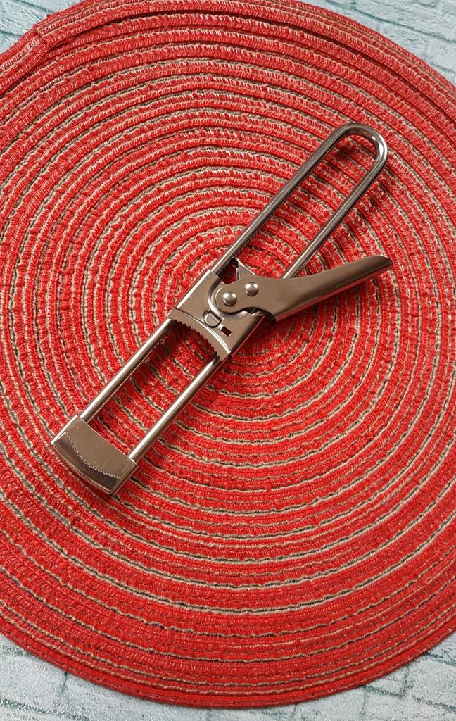 Can opener Adjustable design to fit most bottle sizes. Made of stainless steel. Size: 19cm x 3.3cm Must open cans with canned goods, bottles with drinks and other containers. You just need to clamp the lid with your teeth and press the handle, the lid rises and it is easy to open with your hands. But there is a minus: the metal structure presses the lids so that it makes dents and peels off the paint.
