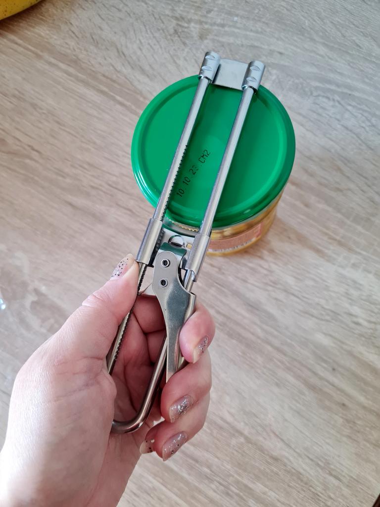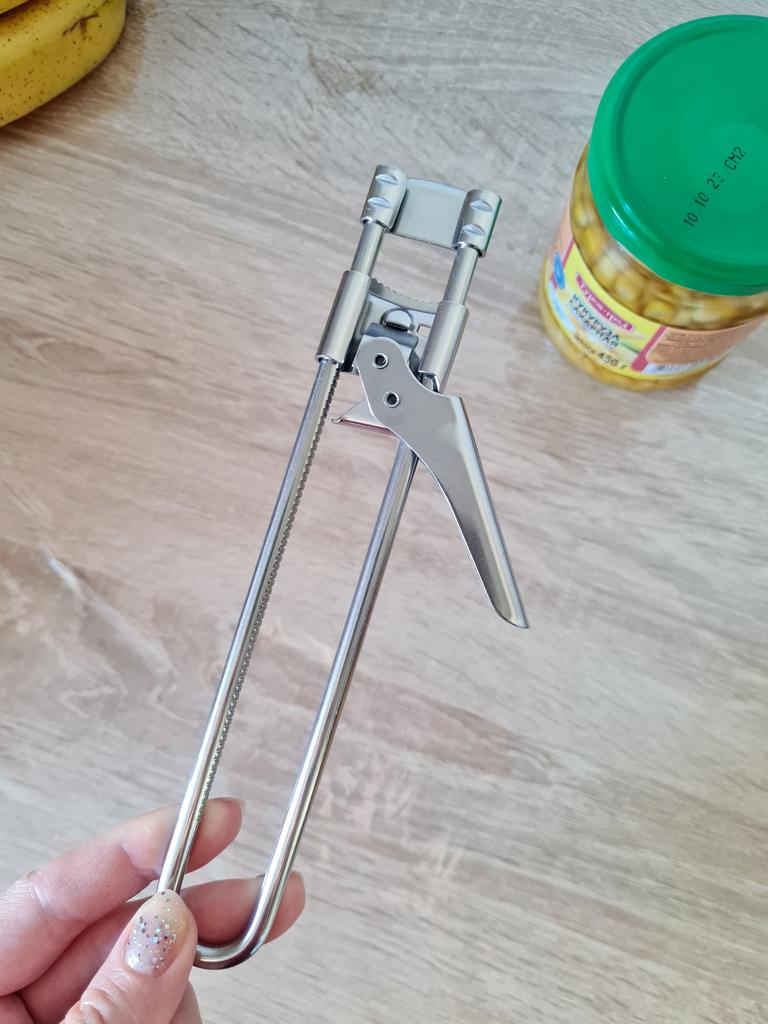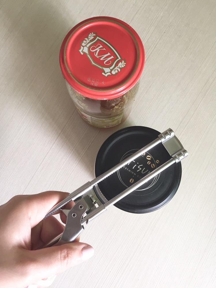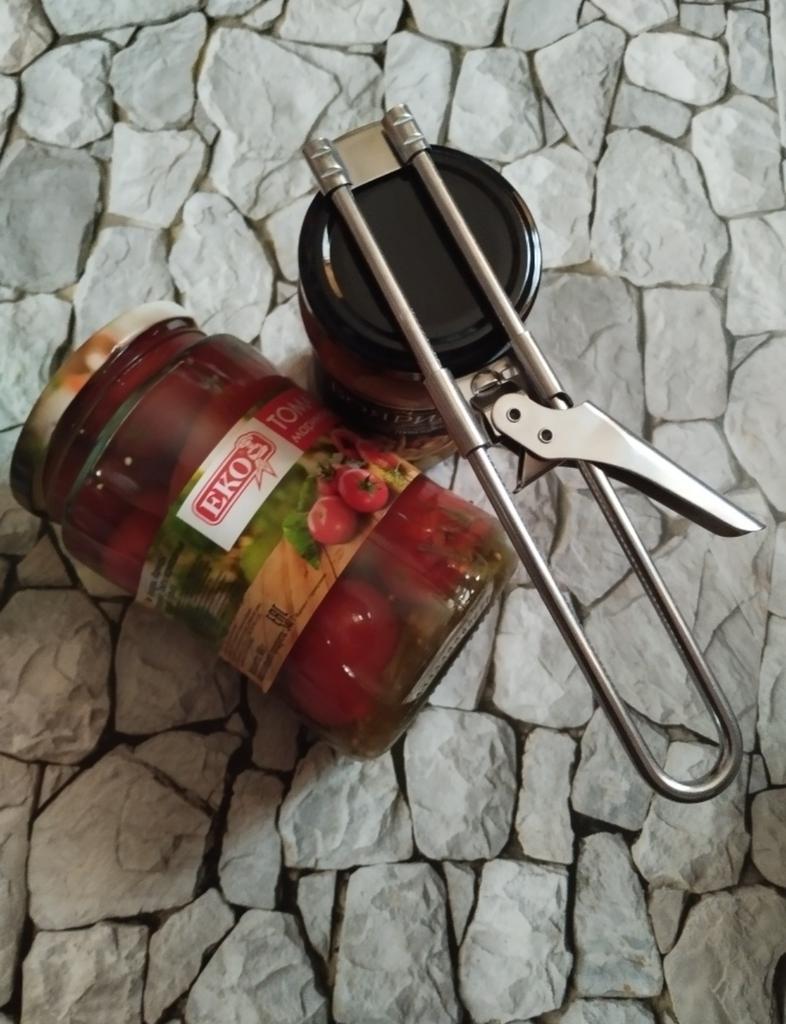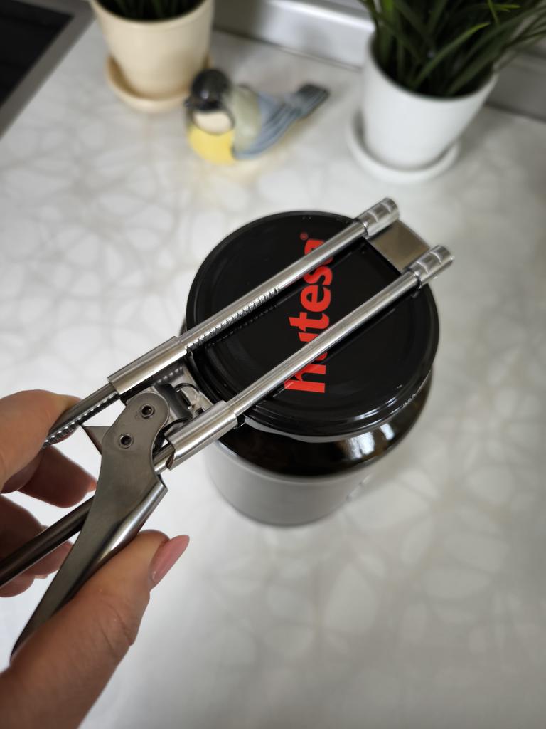 Somehow this opener, we suffered, we barely opened it, or we haven't gotten used to it yet, but we opened it with difficulty, the whole lid was dented, maybe the lid was very tightly sealed, the tool itself is impressive, heavy. I don't know, see for yourself.