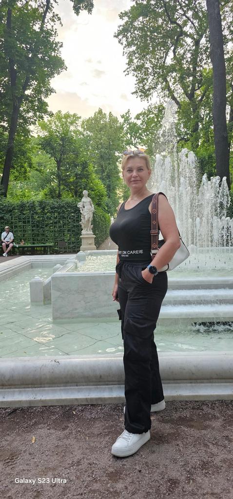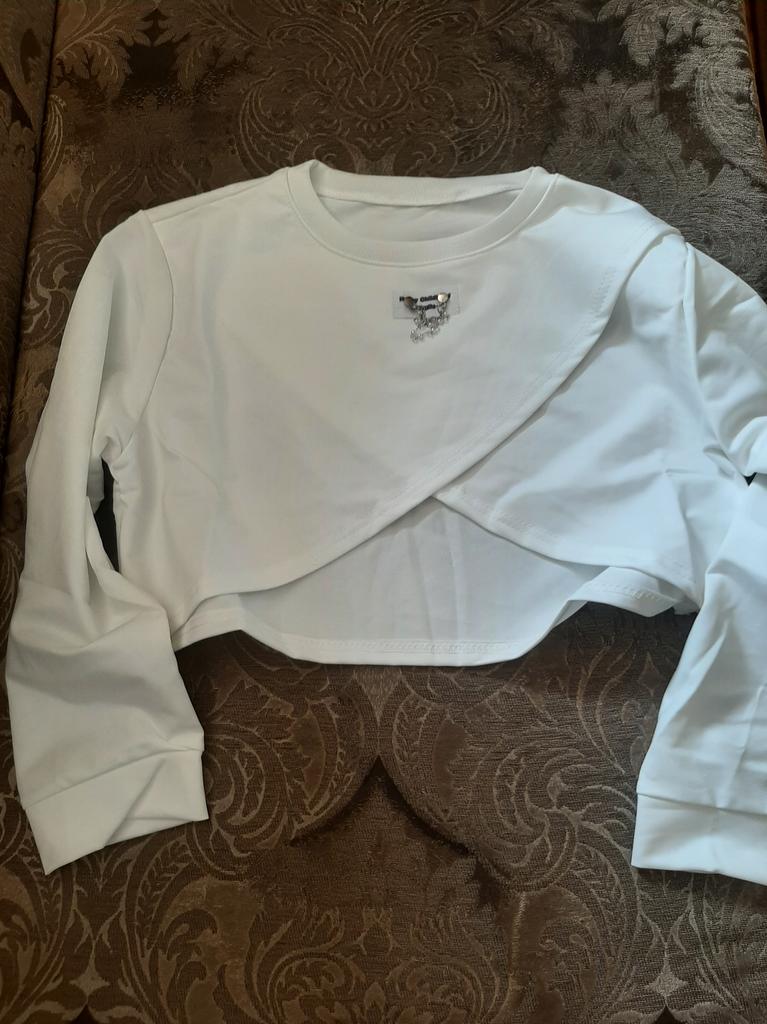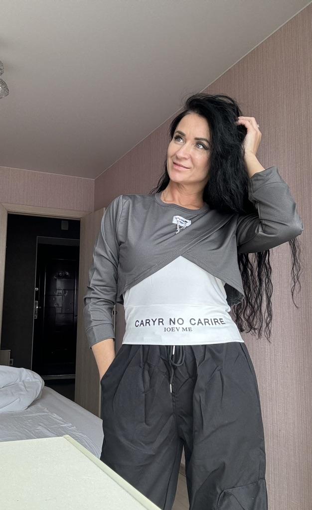 Interesting set. I have a top size 44-46, bottom closer to 50. The pants fit well. The top is right at the limit. The upper white cardigan is okay, but it would be about 5 cm longer, it rides up on the chest somehow. The sleeves are good. Overall it looks okay, the top can be replaced with another one.
