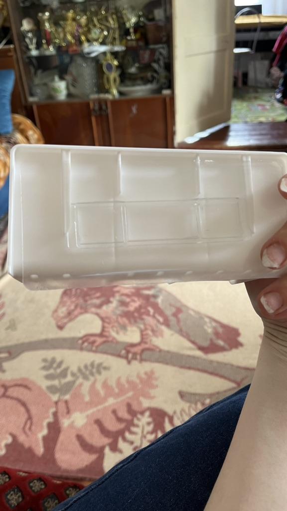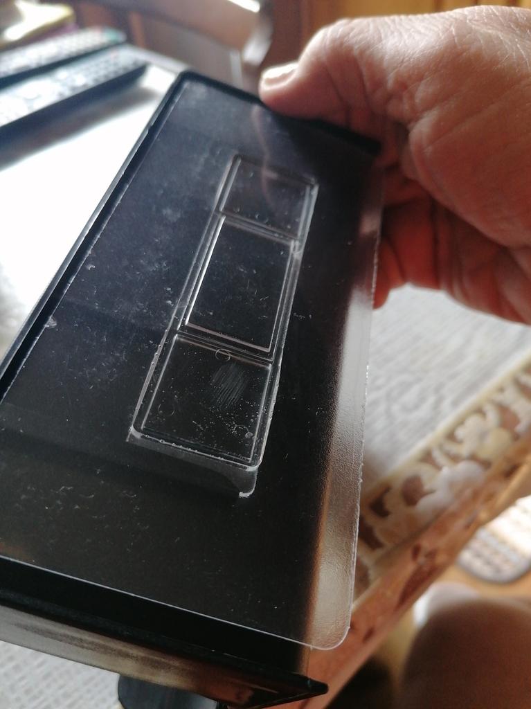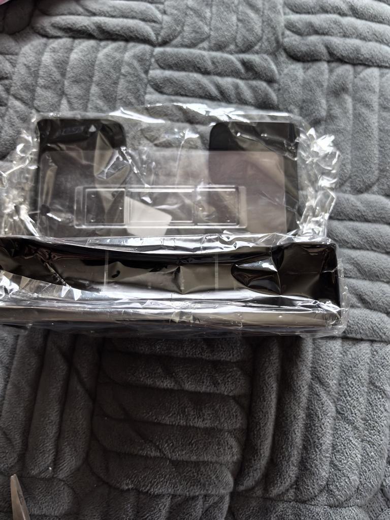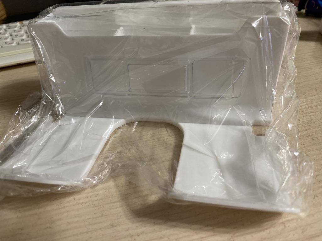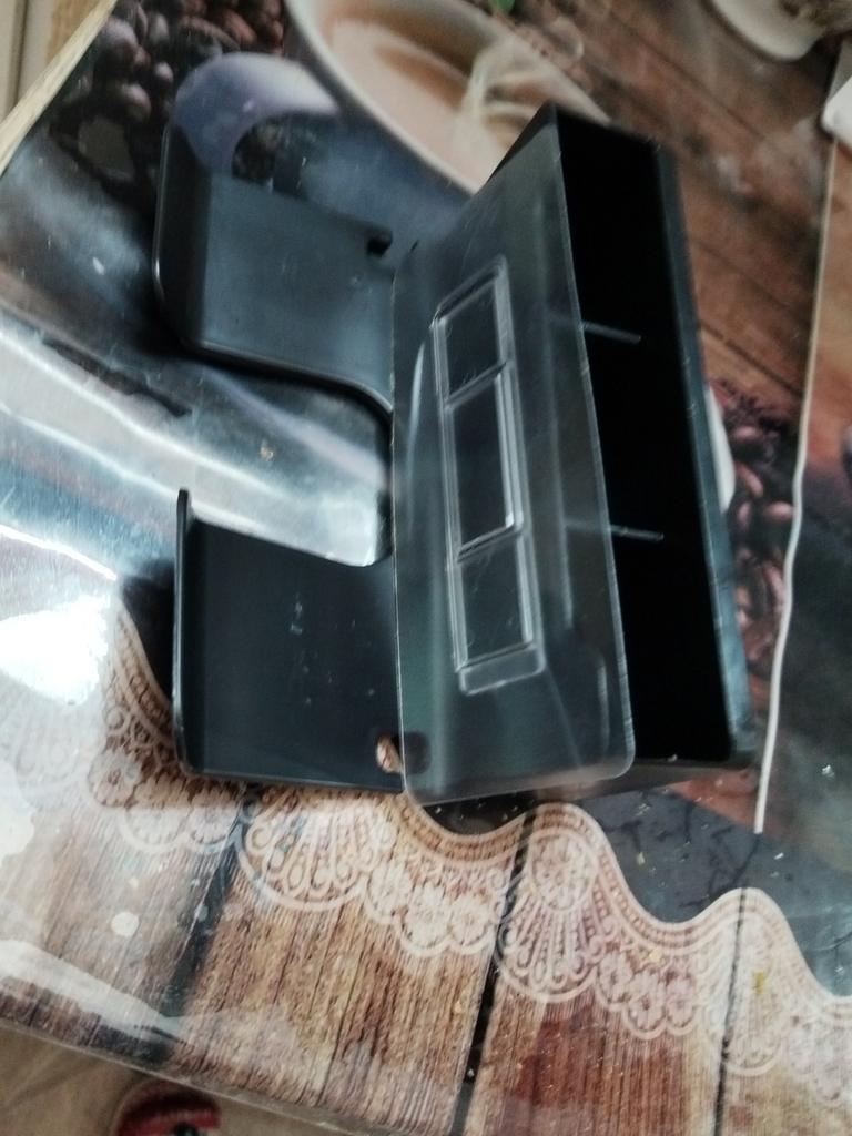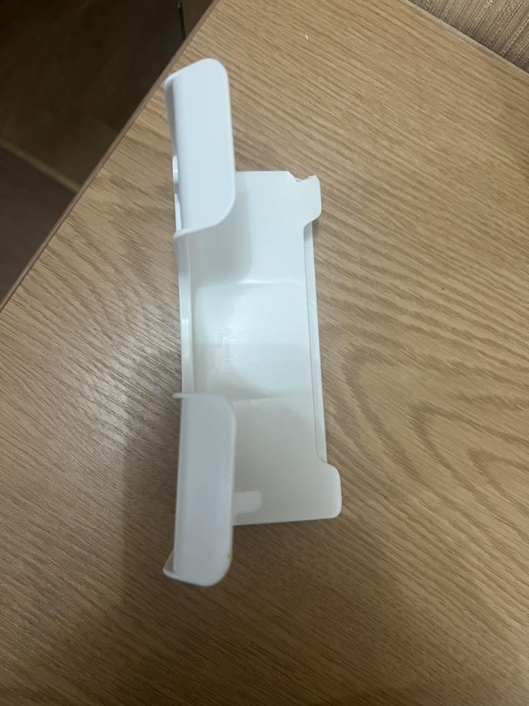 As in the photo. Plastic, whole, neat, there is a wall mount with an adhesive side.