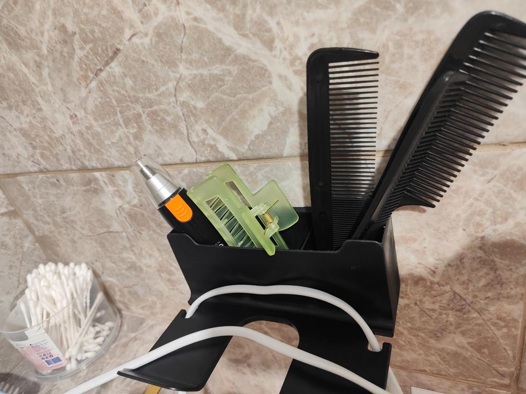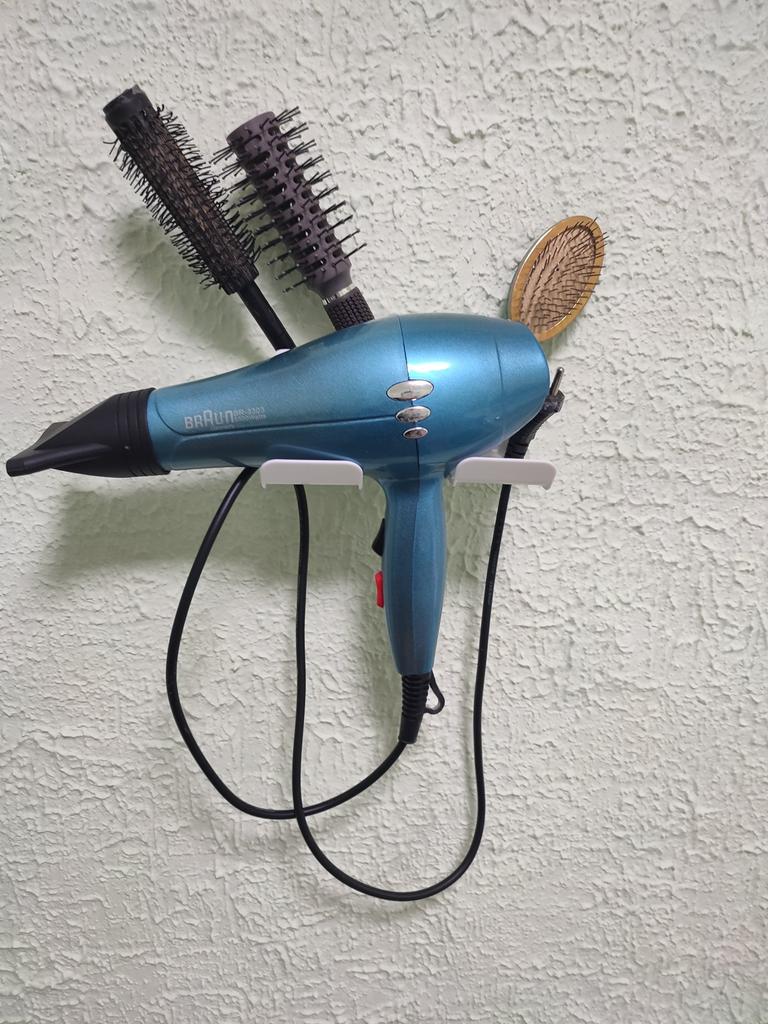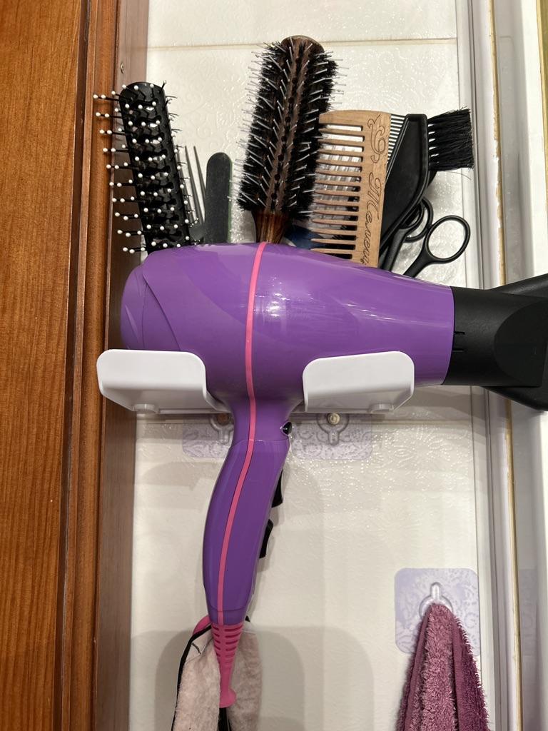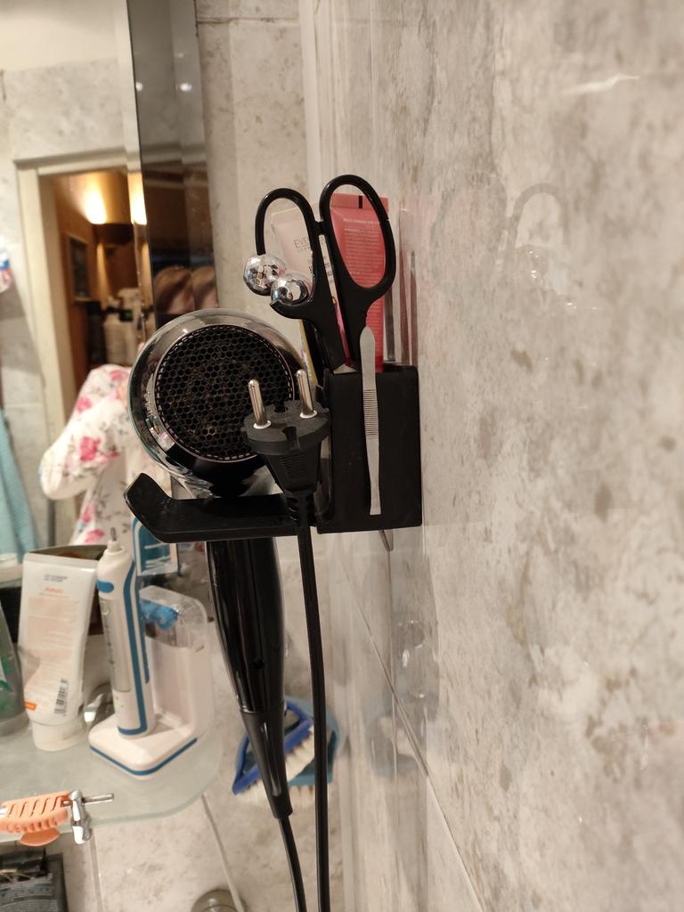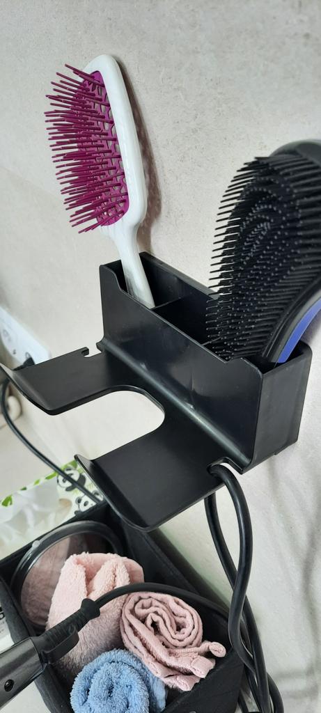 Very convenient holder. It mounts easily and the hair dryer along with the cord doesn't get in the way on the washing machine. And the styling combs are at hand. I'm satisfied.