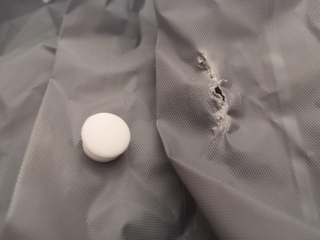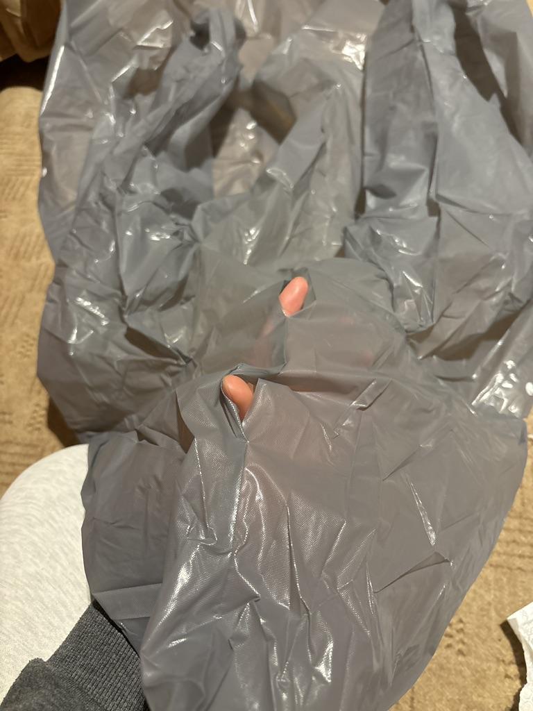 Cellophane , put the bag on yourself , when you stretch the buttons , it bursts