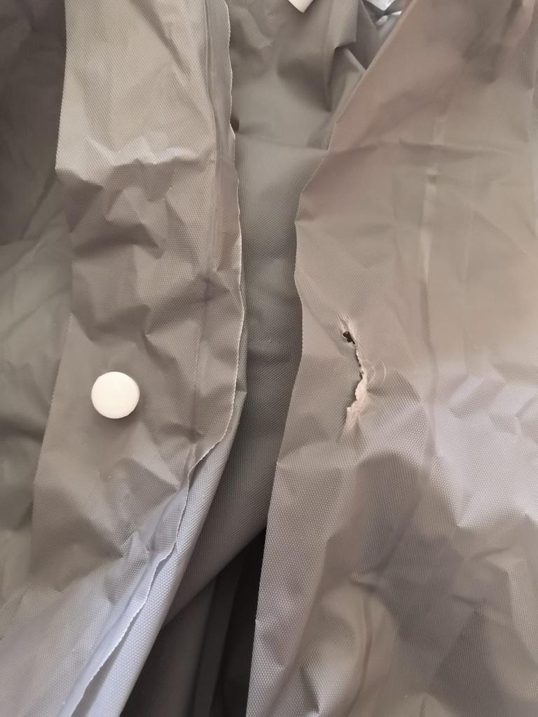 There is a fairly large hole on the shoulder of the hood. The product is damaged.