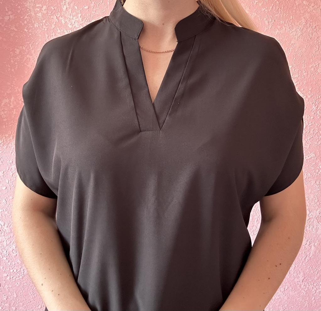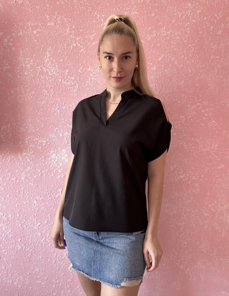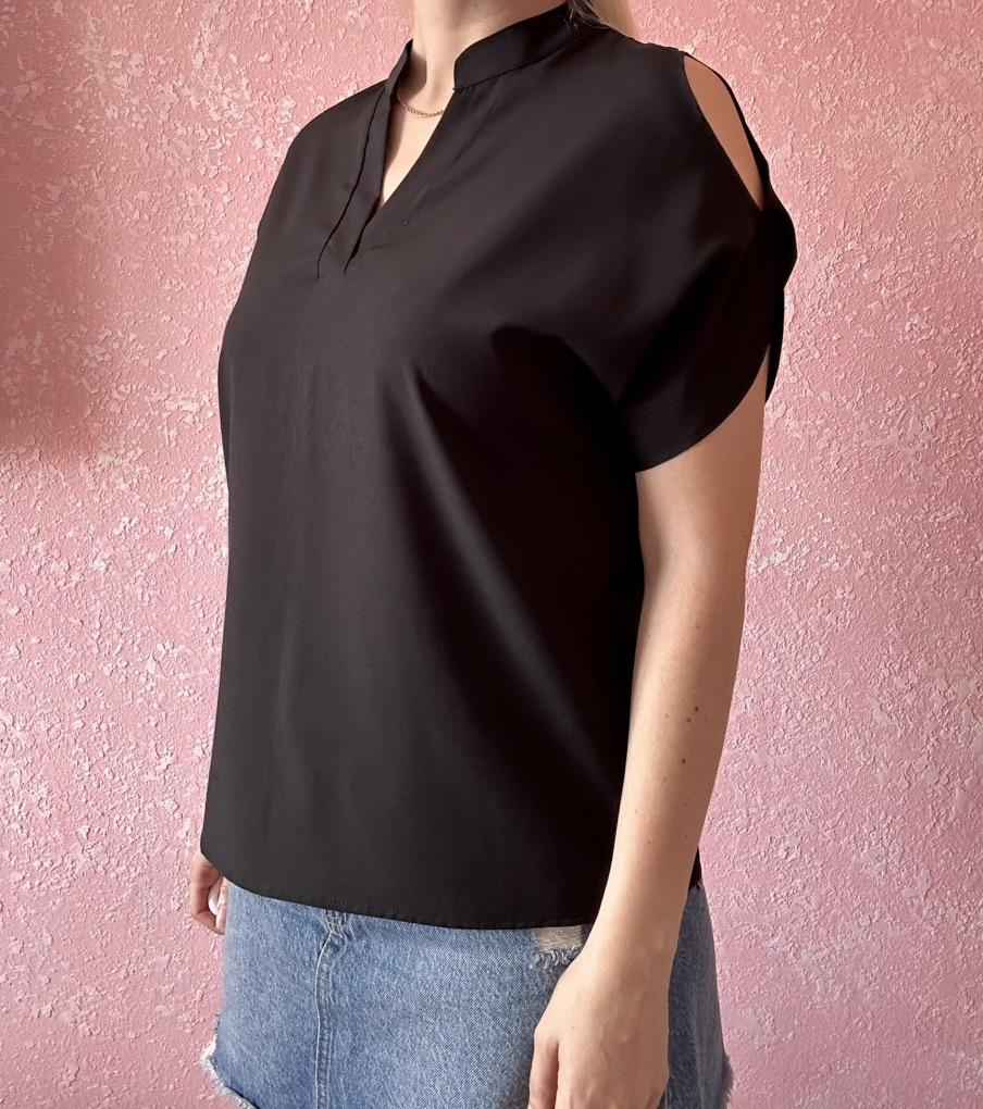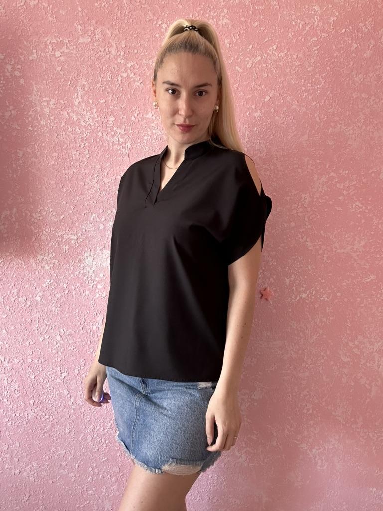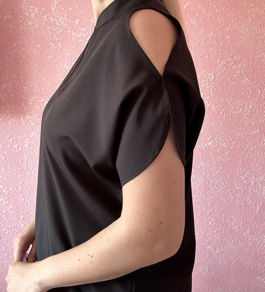 The summer women's blouse is sewn like a soldier's tunic - roughly, but for ages. Moreover, the shoulders pull back, as a result, the slit on the sleeves is visible only from the back.