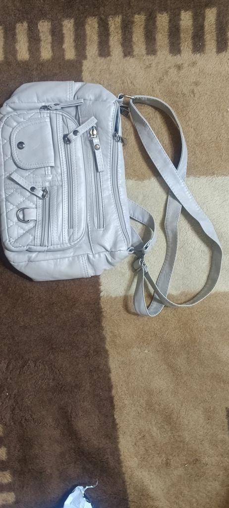 A small, cool handbag with lots of pockets and compartments. Very soft, lightweight. Zippers are sewn in well, everything works. Stitches are even. Color is light gray.