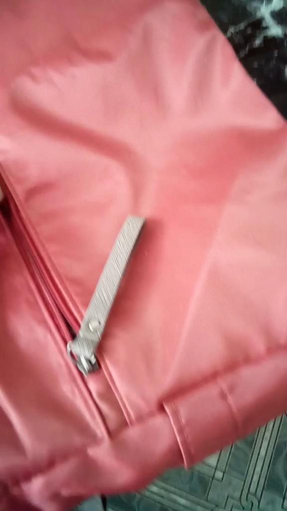 Good bag, nylon, many pockets, has a long handle. A big minus is the very narrow opening and the wide bottom, it's inconvenient to fold things into the bag. On one pocket the snap doesn't match. Cherry color.