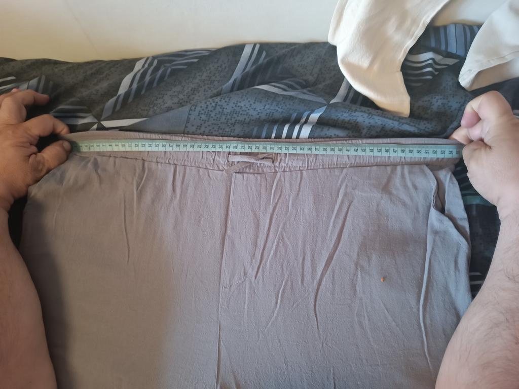 The trousers run small. Half waist circumference for size XXXL is 57 cm for beige and 56 cm for grey. But it should be 63 cm (126 cm full circumference)