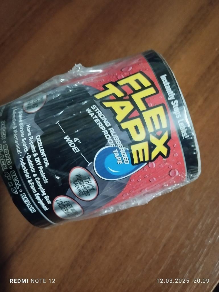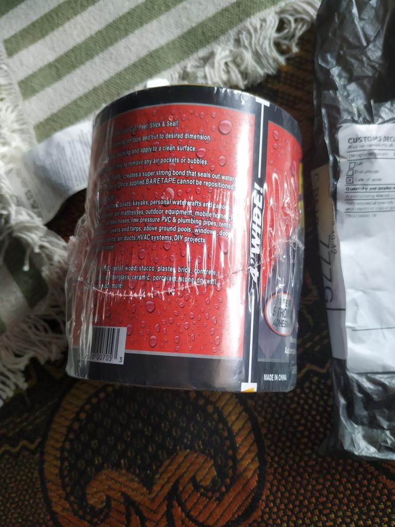 Strong waterproof adhesive tape. This is no ordinary tape. Its triple thick adhesive stops the most severe leaks almost instantly.. Powerful adhesive so strong, it even works underwater. Now you can repair leaks in pools and spas without draining them. Ideal for marine, outdoor and camping. Can make emergency repairs on air mattresses and inflatables, too. you can fix a leak in a pipe, hose. I also checked the tape and tested it on a plastic container, there was a good crack in the middle, I sealed it, poured water, and I will say, it holds well, water does not leak. (see video). Material: PP + hot melt glue Dimensions: tape width - 10 cm, tape length - 150 cm I'm happy with the order and definitely recommend it.
