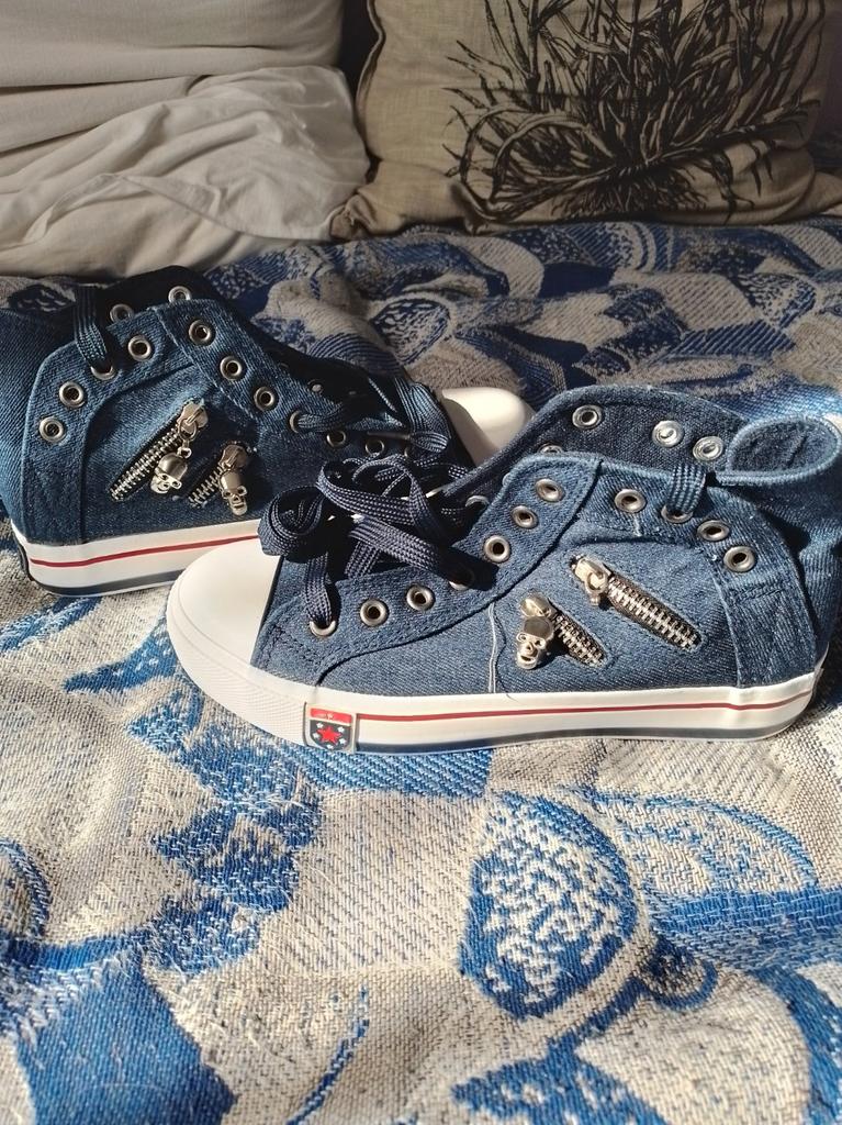 Women's Denim Flat-heel Round Toe Lace-up Skull Metal Decoration High-top Comfortable Fashion Classic Casual Sneakers