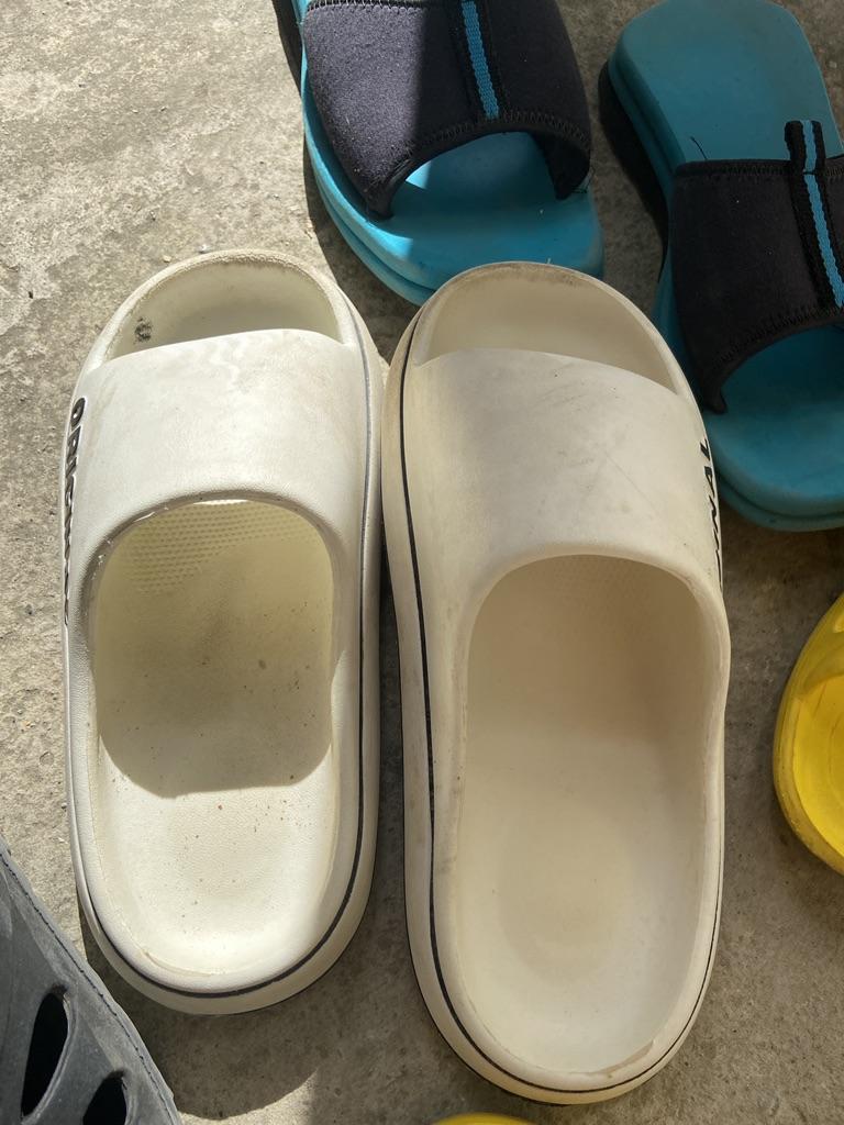 Flip-flops for the sea, cheap and normal, I think they will withstand pebbles, the foot rests in them, they are comfortable