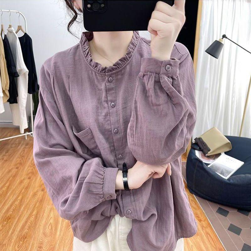 Women Pure Cotton Long Sleeved Shirt for Women Spring Autumn Loose Retro Top Pleated Base Shirt