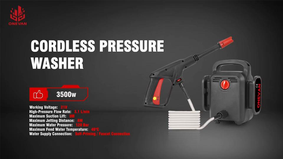This powerful cordless pressure washer delivers high-pressure cleaning performance in a lightweight, portable design. With a 3500W motor, 120Bar water pressure, and 3.1L/min flow rate, it easily handles a variety of outdoor and household cleaning tasks. Its dual water supply mode and long-range operation make it perfect for car washing, garden irrigation, and more.