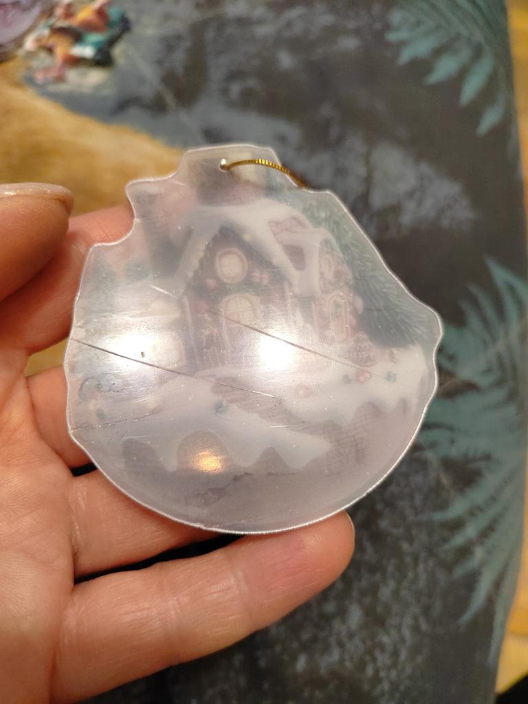 An unremarkable plate of polymeric material, in no way resembling a Christmas tree ornament.
