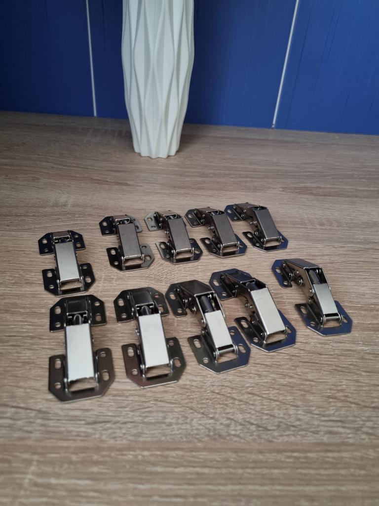 ❤️👍Overlay furniture hinges "frog" The set includes 10 pieces, which is very convenient. Opening angle - 90 degrees, size - 8cm. The mechanism is working properly. They are installed on self-tapping screws. good buy!