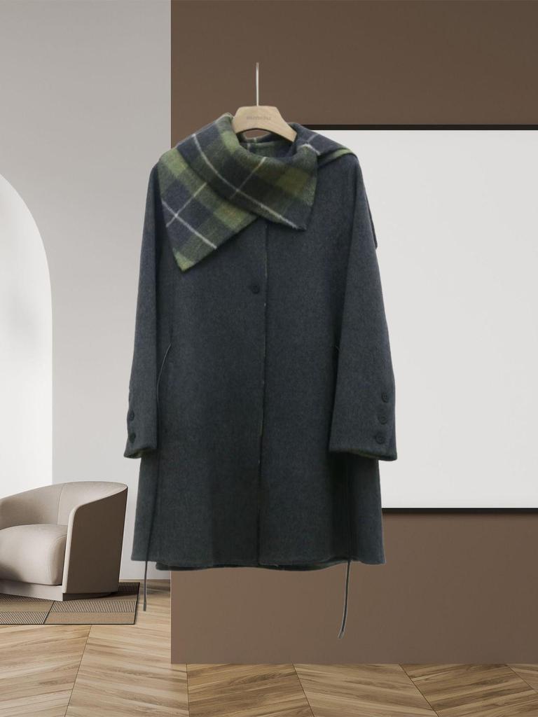 Women's Mid-Length Double-Faced Wool Coat with Detachable Plaid Collar and Tie-Waist