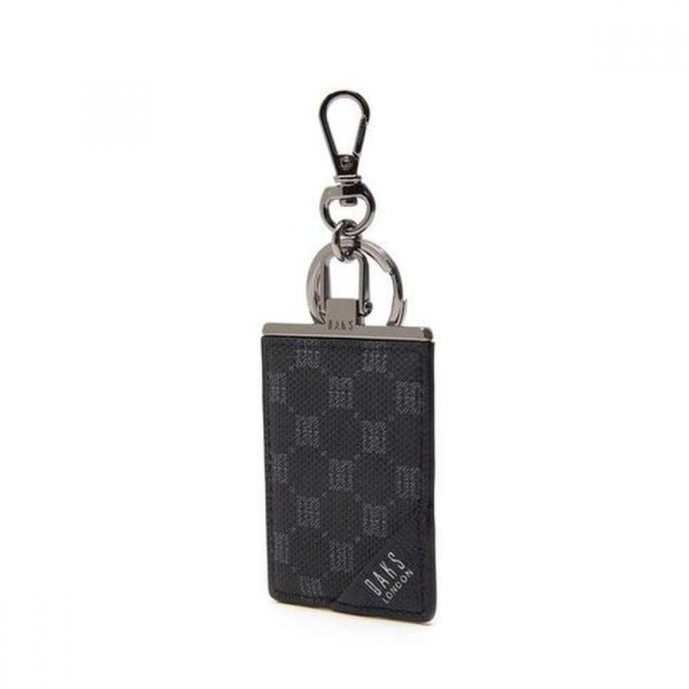 The Daks Black Leather DD Logo Keyring DBHO2E138 features a modern design with a black leather base adorned with DD logo decoration and DAKS logo, providing a unique touch. This product is unisex and suitable as an everyday fashion item.