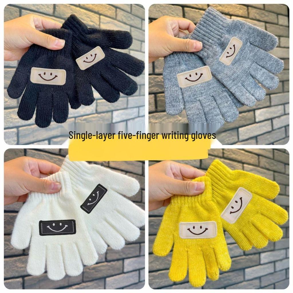 Korean Style Kids' Woolen Knit Five-Finger Gloves with Smiley Face for Autumn/Winter Warmth