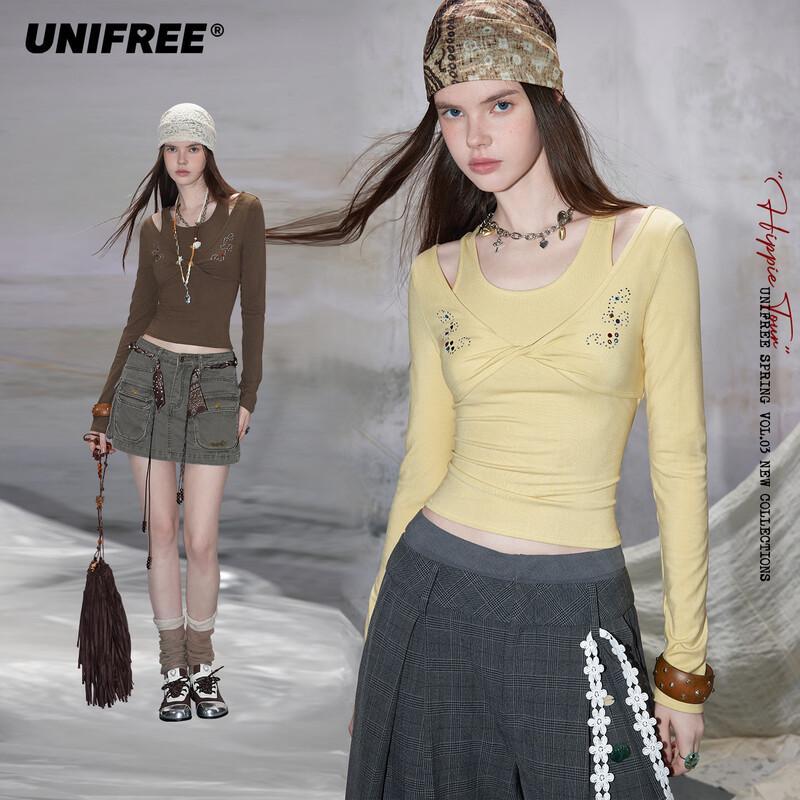 unifree 2026 Spring Korean Style Cross Design Faux Two-Piece Slim T-Shirt