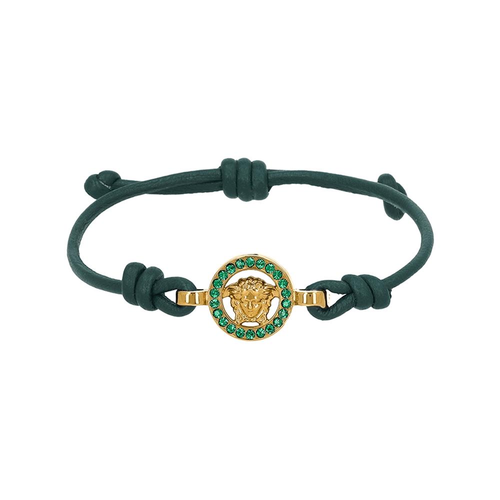 The Versace 1019668 1A05169 1GA9V Medusa Crystal Braid Leather Bracelet is crafted from premium lamb leather, presenting a stylish design. With its luxurious green color, this piece adds an elegant touch, while the Medusa logo embellishes it, perfectly expressing the brand's identity.