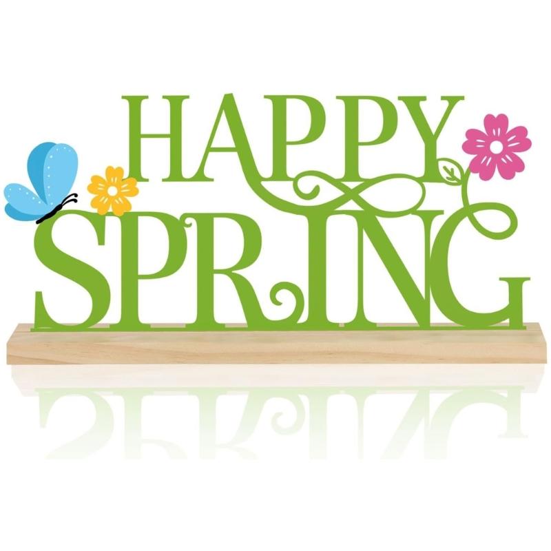 Metal Happy Spring Decorations The Package includes a green metal 'Happy Spring' sign and a wooden base. It can easily bring you a simple but bright feeling.