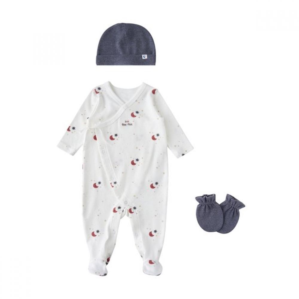 The Petit Palais Apéfé SET Baneuji suit consists of a unique Apéfé-patterned romper, hat, and mittens, making it a gift-worthy 3SET item. It uses soft Lyocell fabric, offering excellent moisture absorption and is suitable for delicate baby skin.