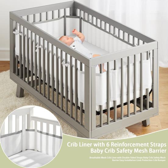 Safe and Breathable Design: Our crib liner is crafted from polyester fiber with a safe fit featuring double-sided straps for added security. With six reinforcement straps per panel, sagging is prevented, ensuring a snug and secure installation on any standard crib. The breathable mesh material with honeycomb holes allows for optimal air circulation, ensuring your baby can breathe smoothly even when close to the liner.