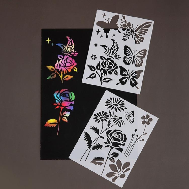 Discover the versatilities and possibilities with 5Pieces reusable PET drawing stencils, features hollowed butterfly, flower and leaf pattern, great for wall art, fabric printing, sketching and creative art craft project.