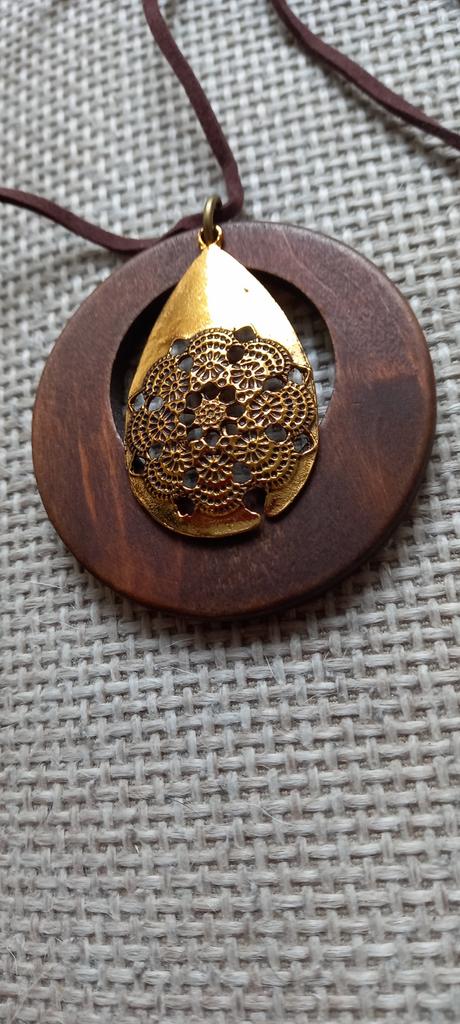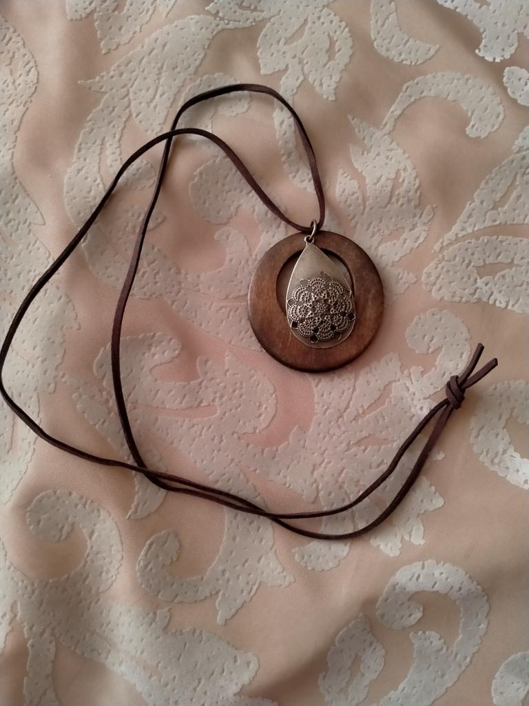 Un ottimo modo per decorare un maglione o un maglione. Pendente composto da anello in legno con elegante inserto in rilievo + cordino in pelle scamosciata.