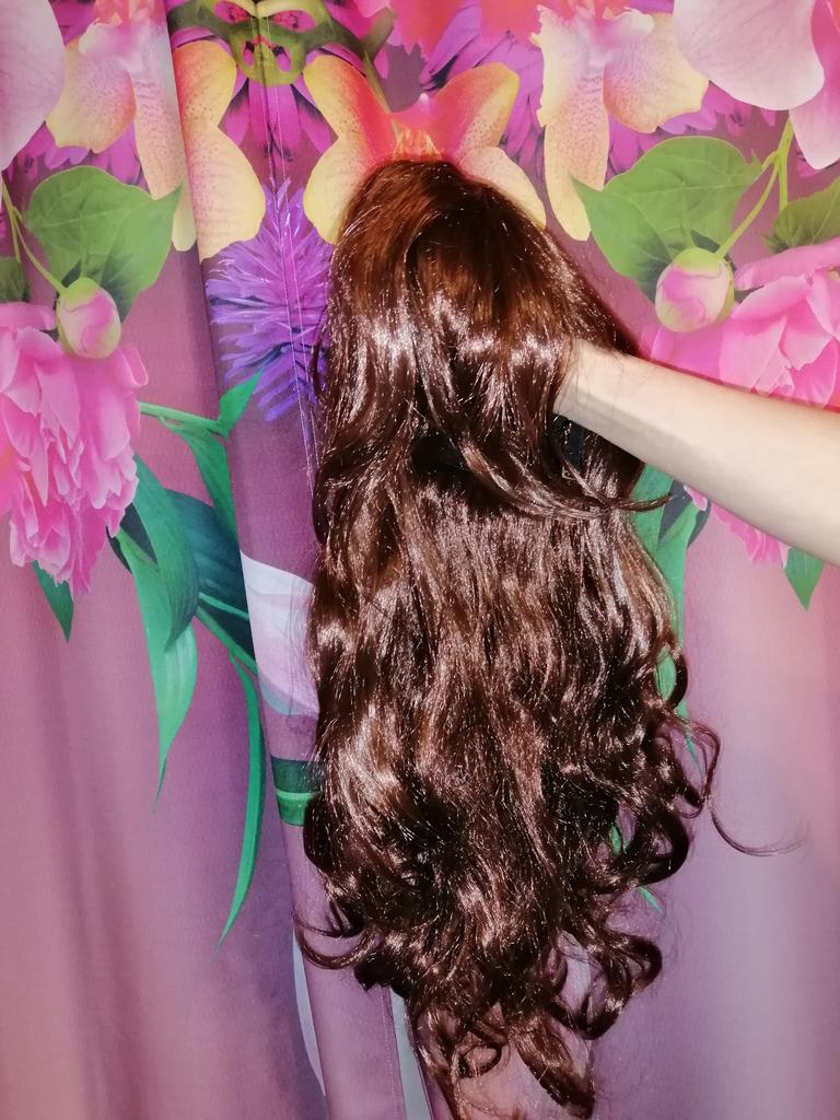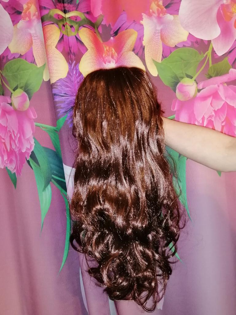 Parrucca stupenda! Il colore è castano-rossiccio, un po' lucida. Si trova in una retina e in una busta con zip, attorno alla busta c'è una striscia di cartone spesso ma stropicciato durante il viaggio.. La frangia è lunga, ma non la taglierò - è tutto in un unico stile. Prezzo ragionevole Lo consiglio vivamente.