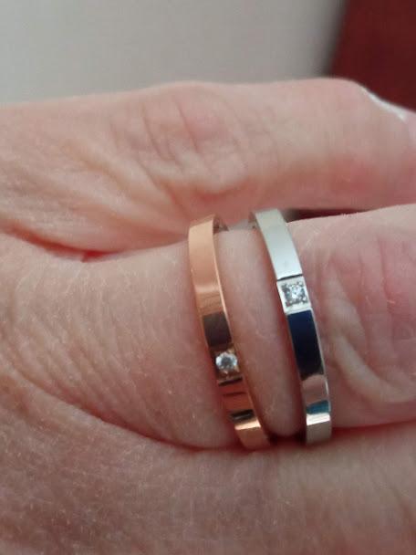 È bello fine elegante Ha una piccola pietra lucida al centro. La sua forma è diversa, piatta e di colore oro rosa. Un simpatico 💘