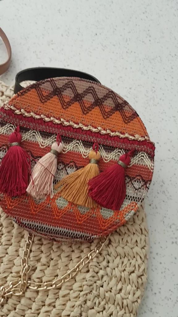 Borsa a tracolla da viaggio estiva in paglia intrecciata circolare estiva